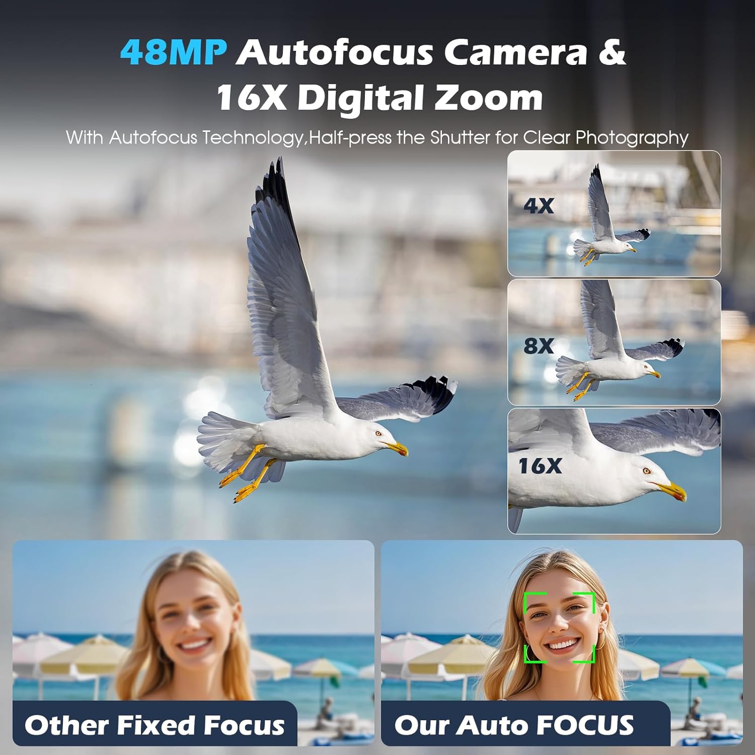 【Ultra HD 4K & 48MP Digital Camera】 This 4K digital camera can take 48MP pictures and record 4K videos.This compact camera supports 16x digital zoom, enough for your photo needs. Compared with traditional cameras, it adds selfie, video pause function.We also provide you with a 32G memory card, so there is no need to buy a separate memory card.(The default pixel of our camera is 7MP in power on mode, press MENU button in camera mode to adjust the resolution of the photo to the highest 48MP in Resolution interface, so as to take high quality and clear photos.)