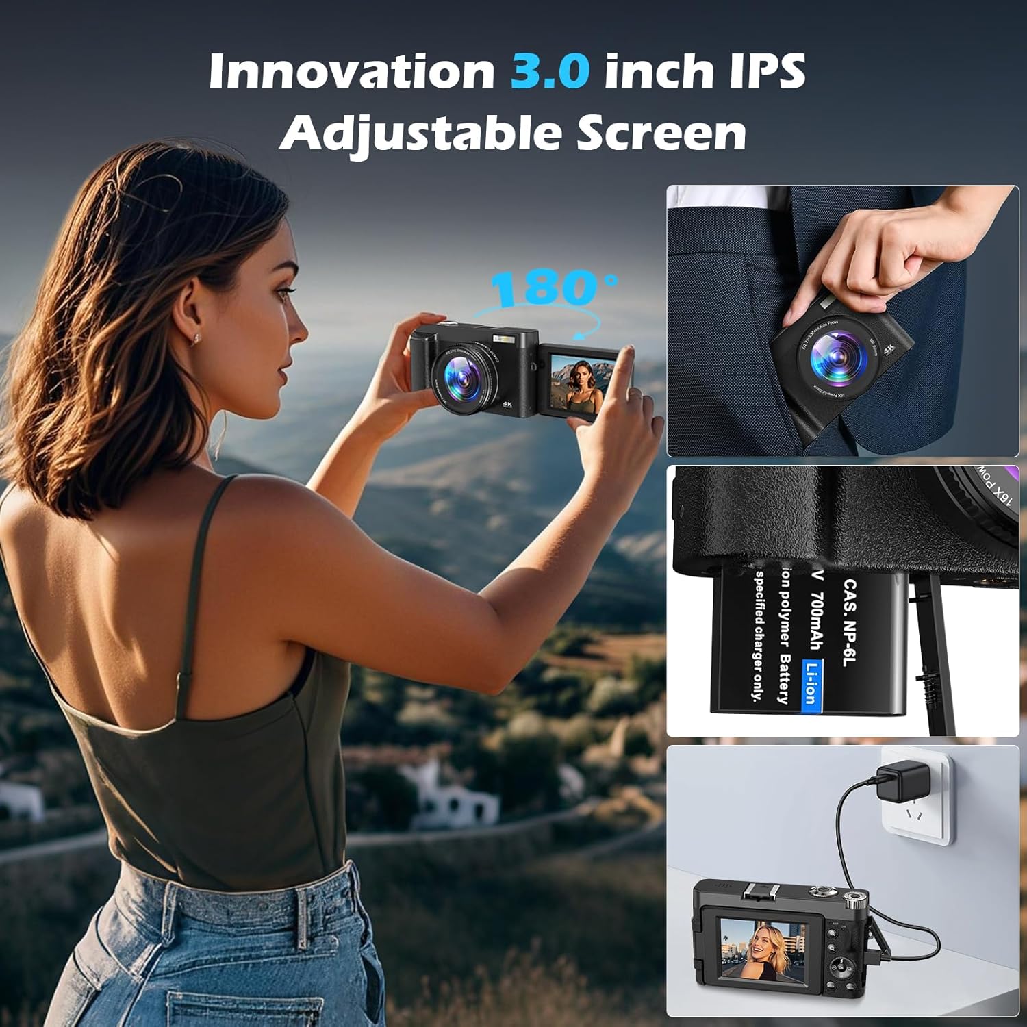 Iâve been using this 4K Digital Camera for a few weeks now, and honestly, Iâm impressed with what it offers, especially for the price. Itâs lightweight, compact, and packs a ton of features that are perfect for beginners, casual photographers, or anyone starting a YouTube or TikTok channel. One of my favorite features is the 180° flip screen, itâs perfect for framing selfie shots or vlog content. The autofocus is quick and accurate, and I love the 16X digital zoom for capturing shots from a distance. While it won’t outperform a DSLR, itâs an excellent compact option for everyday use, travel, or content creation. It came with two batteries and a 32GB SD card, which is super convenient and saved me an extra purchase. Battery life is solid enough for a day of casual shooting or filming. The camera is also lightweight and easy to carry around. Overall, this camera is perfect if youâre getting into photography, travel blogging, vlogging, or just want better quality than your phone without spending a fortune. Itâs easy to use, portable, and packed with thoughtful extras. Recommend it!