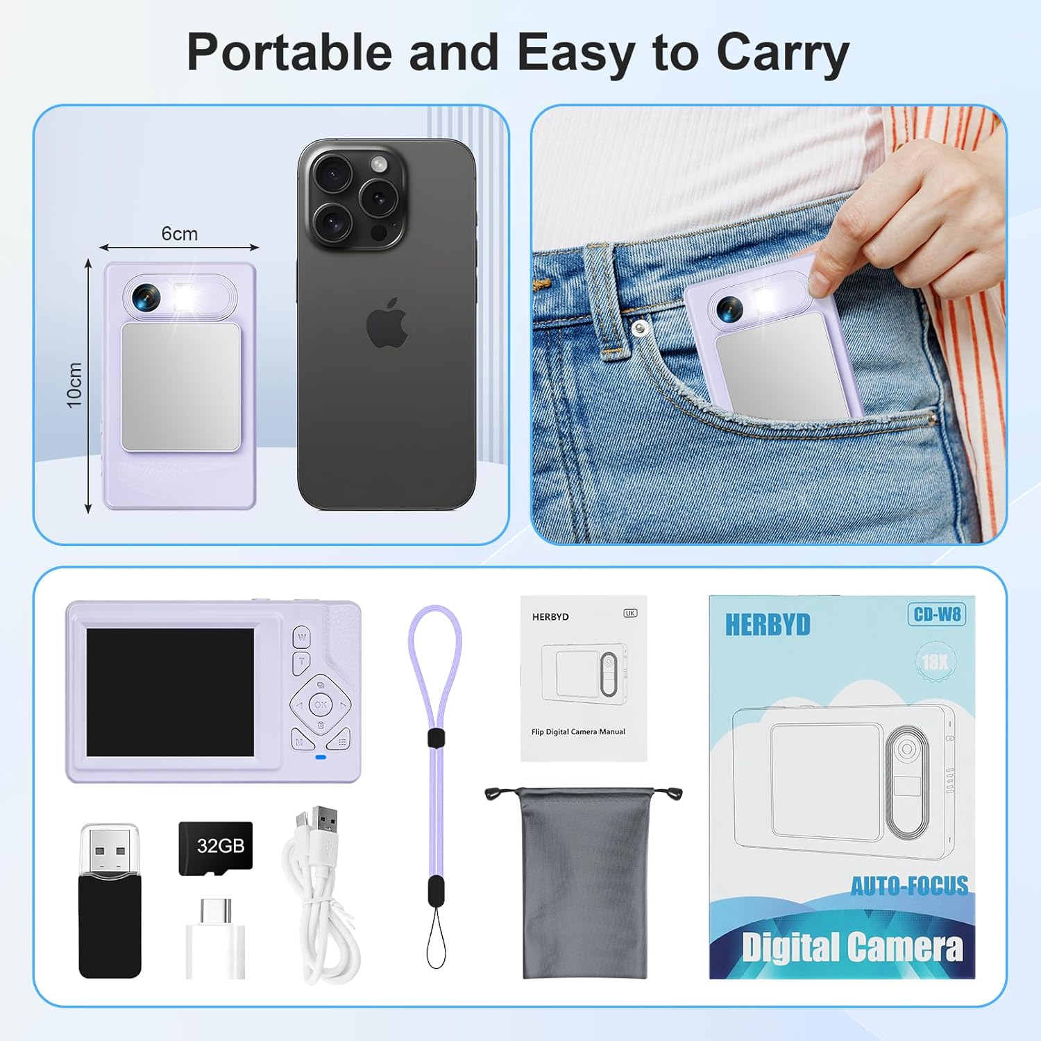 Portable and Practical: Package includes digital camera, 32GB memory card, card reader, user manual, USB charging cable, adaptors, storage bag and lanyard. You can use the digital camera to take photos and vlogs at birthday parties, picnic parties, concerts, graduations and travel. It’s a great camera for kids, students, adults, seniors and beginners, perfect as a christmas, birthday, holiday present