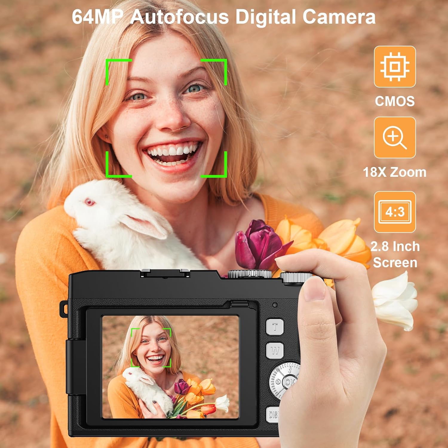 Digital Camera 4K 64MP Autofocus Vlogging Cameras with 32GB Card & Macro Function, 18X Digital Zoom Compact Camera with 2.8” 180° Flip Screen & 2 Batteries for Teens Beginners Adults