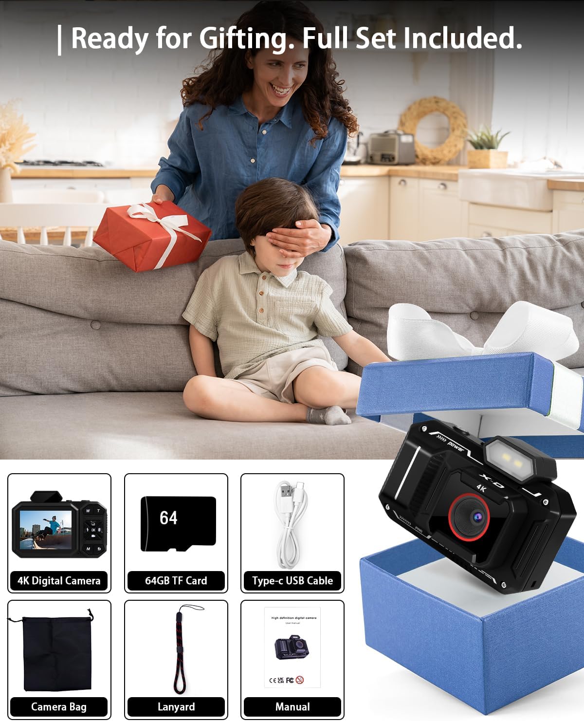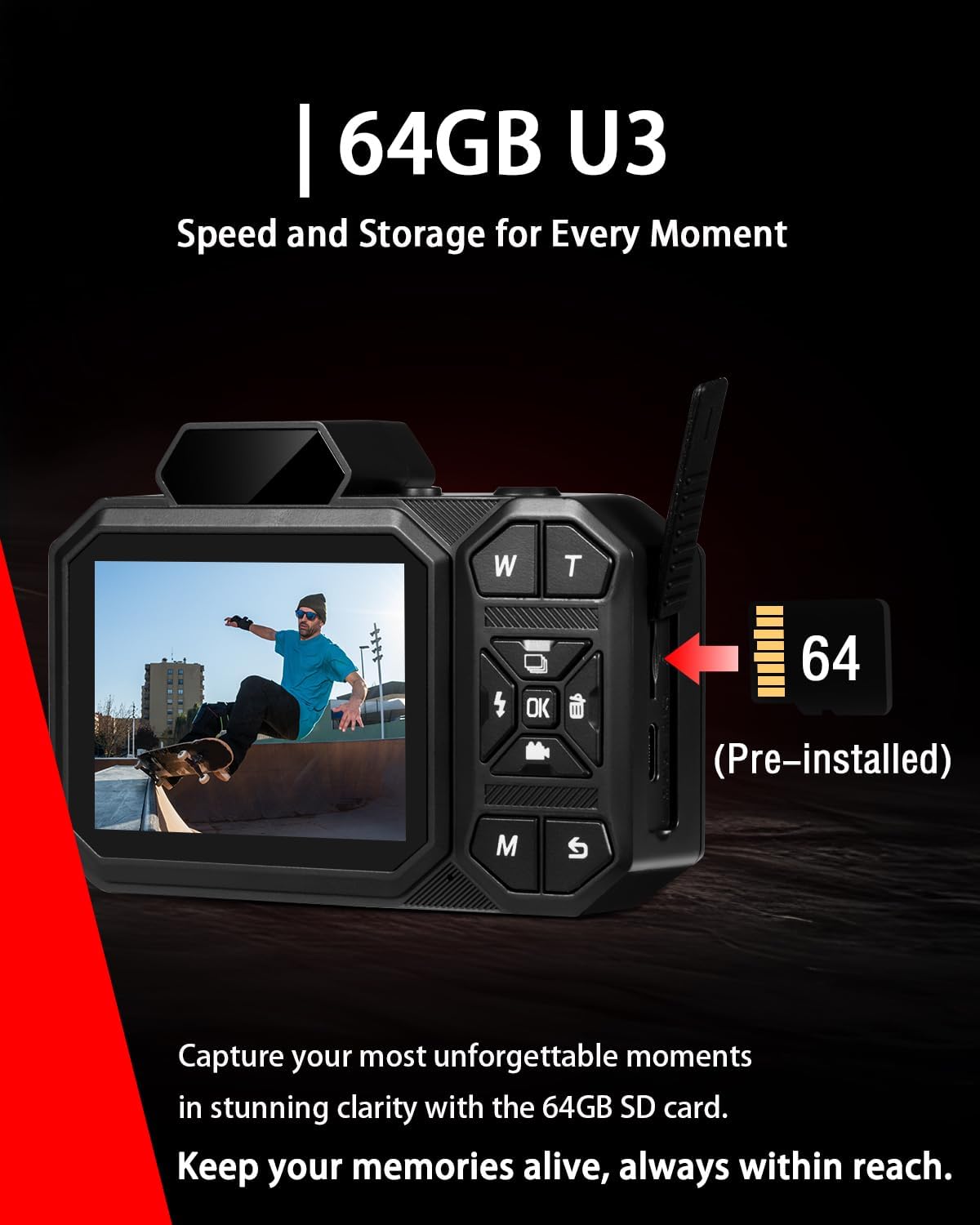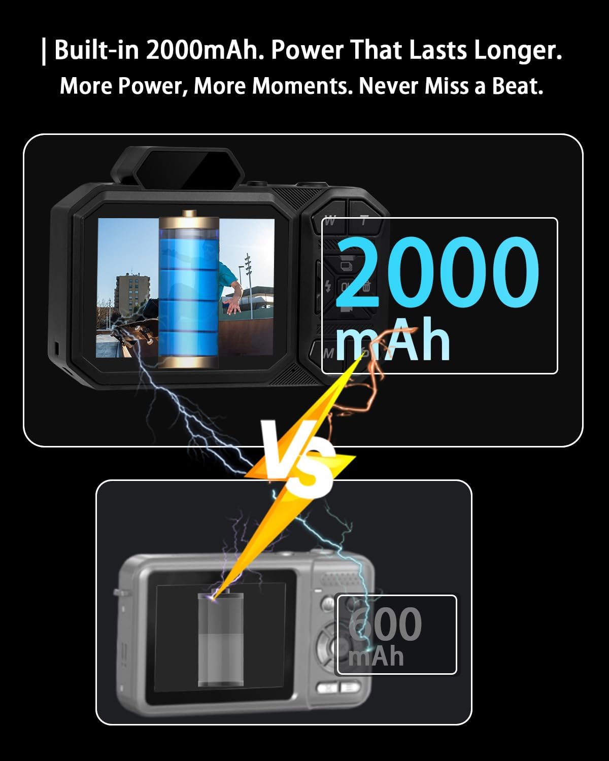 【Larger 2000mAh Battery & Free 64GB Card】 Benefit from a powerful 2000mAh battery and advanced energy-saving technology, ensuring longer usage time and fewer charges, perfect for vacations, events, and family moments. This cameras for photography included 64GB memory card, offers plenty of storage for HD videos and travel photos, so you can shoot more and swap less.