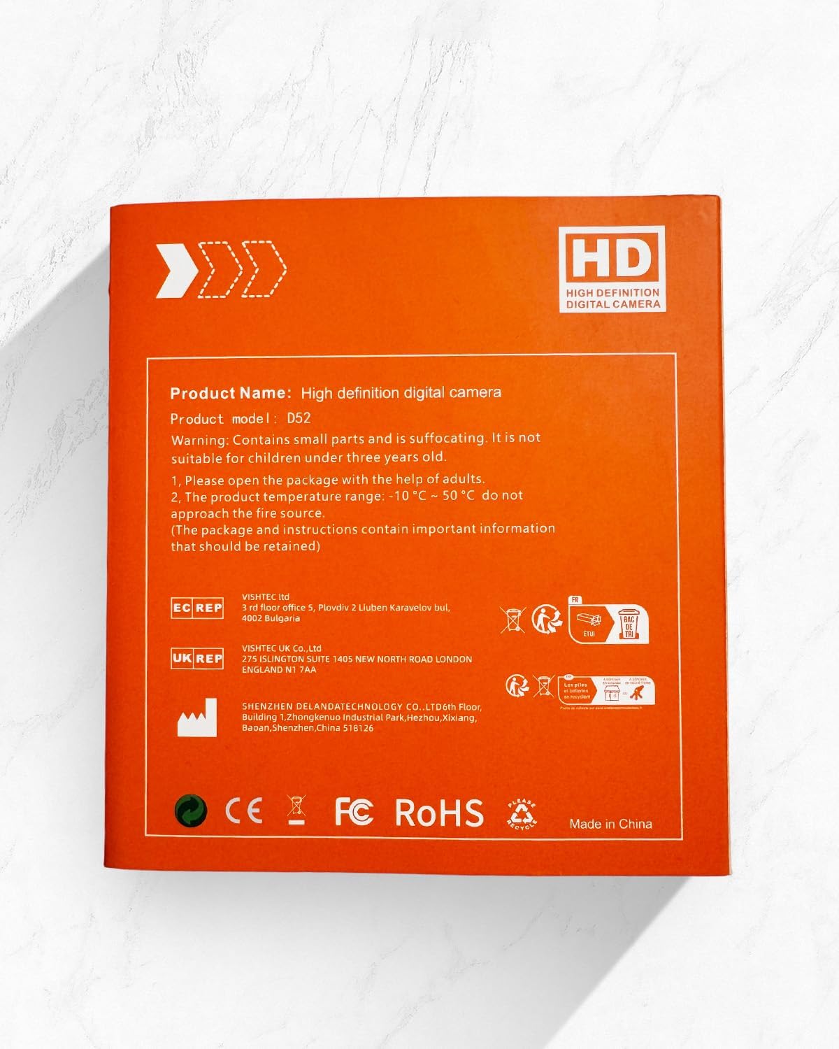 The Bextgoo digital camera arrives in a printed cardboard box – suitable for a gift.Printed on the box are the CE, FCC & RoHS marks confirming that this camera meets EU and USA conformity standards and is free of hazardous substances.I set the parameters by going through all the settings time, date, stamp focus etc. It was fiddly and took some time but not too much of a drag. After taking a few shots on focus and semi-automatic – I set it to automatic.I then used the digital camera to take a shot and then immediately used my pixel phone to take, as close as possible an identical shot. I have attached both – the digital camera is the first.I order this as I was intrigued as why, in a country where many have phones, try to sell a digital camera? With my pixel phone I take a shot – it goes automatically to my photoâs library (on phone and computer) and I can immediately share it with whom I wish.With the digital camera I take the shot, then have to remove the SD card, then use an adaptor to download the photo onto my computer, then download it into my photo library and the share it. I did all of this to test it but the photo was certainly not of sufficient quality to make this all worth while.I realise that this camera at £70.00 is priced less than a phone – but it only takes photographs and not high quality photos.The price tag and the setting are too high and complex for a child that is too young for a phone – and I certainly would not buy it at that price. Not sure what the market is for this device – but it is not for me.