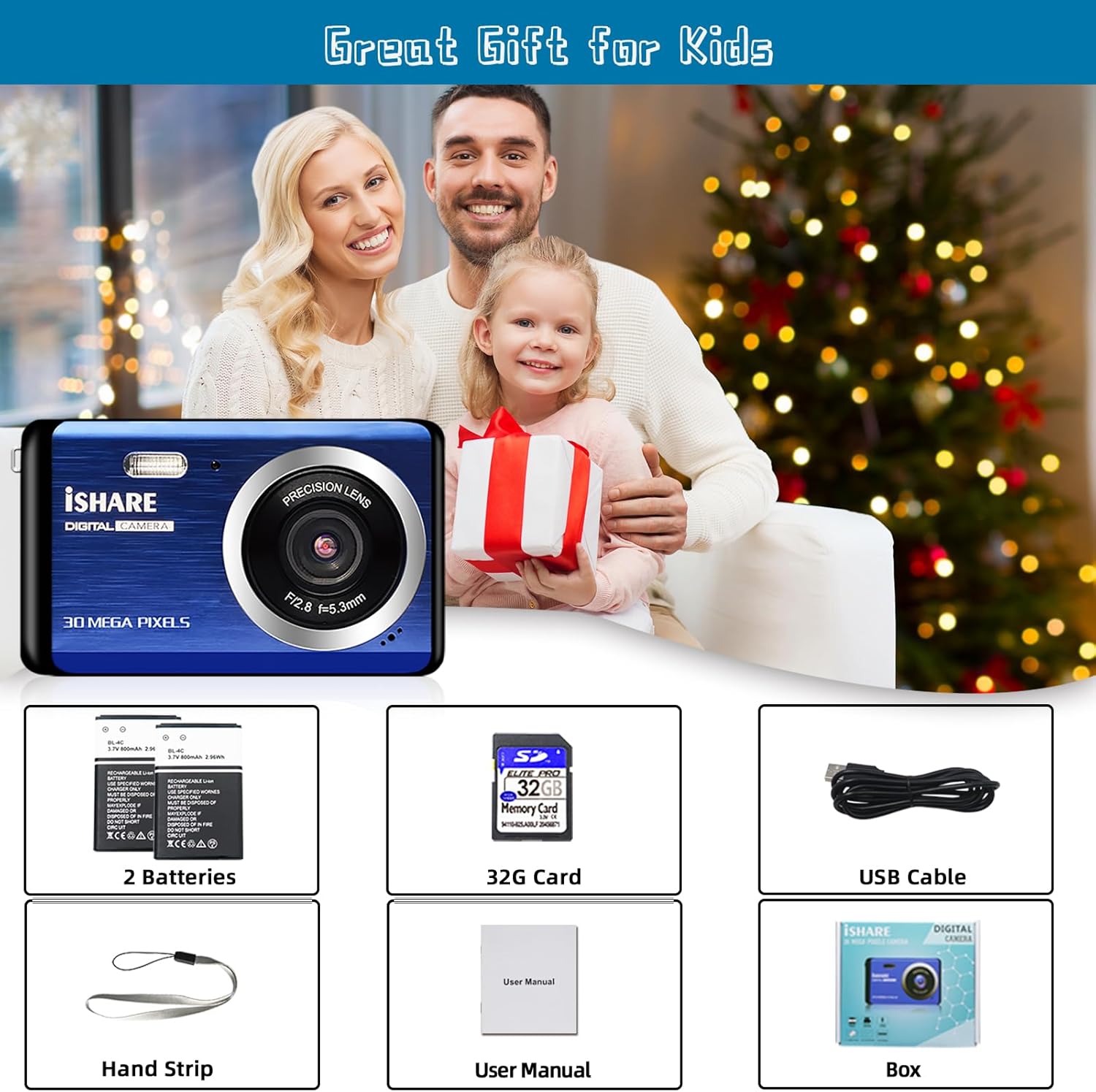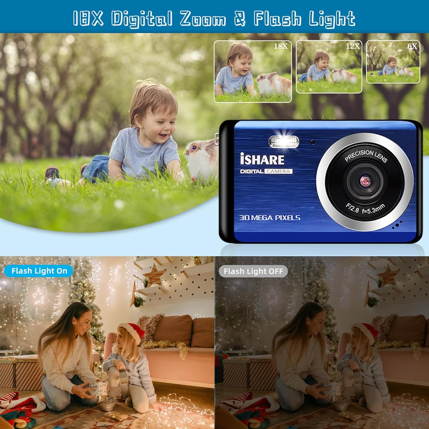 Digital Camera for Photography with 2 Batteries 32G Memory Cards,18X Digital Zoom 30MP Point and Shoot Cameras,Small Camera for Kids/Adult/Elderly/Beginners(Blue)