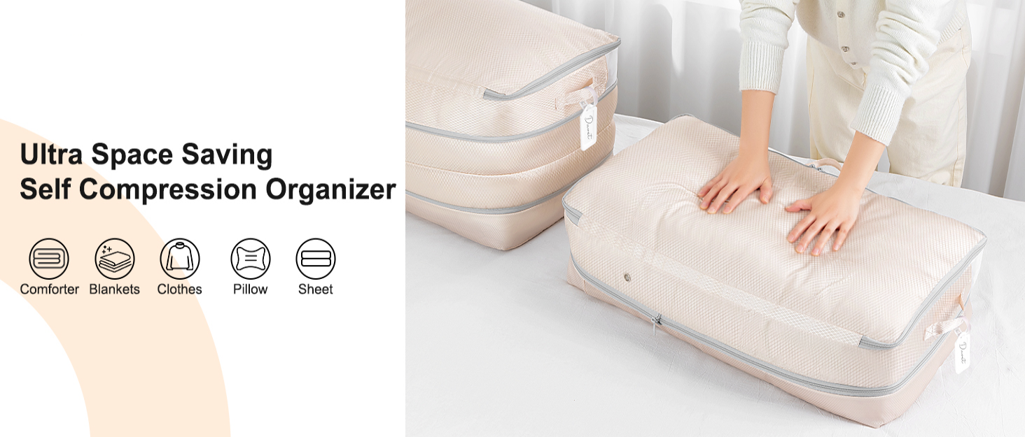 [ Easy to Store Indoors, Move And Travel ] This ultra space saving self compression organizer is perfect for comforter storage, blanket storage, pillow storage, and other large items, allowing you to make the most of every inch of space in your closet or under-bed storage. And save even more space in bedrooms, wardrobes, closet, cabin, trunk, suitcases and backpacks