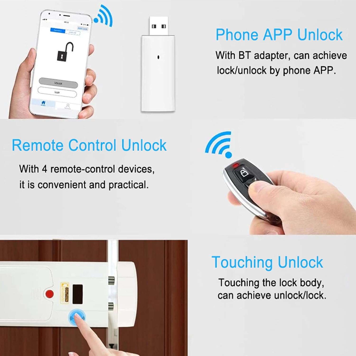 【EASY With 4 remote controls, you can put these keys in various places in the home, can control the door lock at any location in the house, which is very convenient. If you cant find the remote control, dont worry, you can touch the door lock switch to lock/open the door, which is useful in emergency situations.