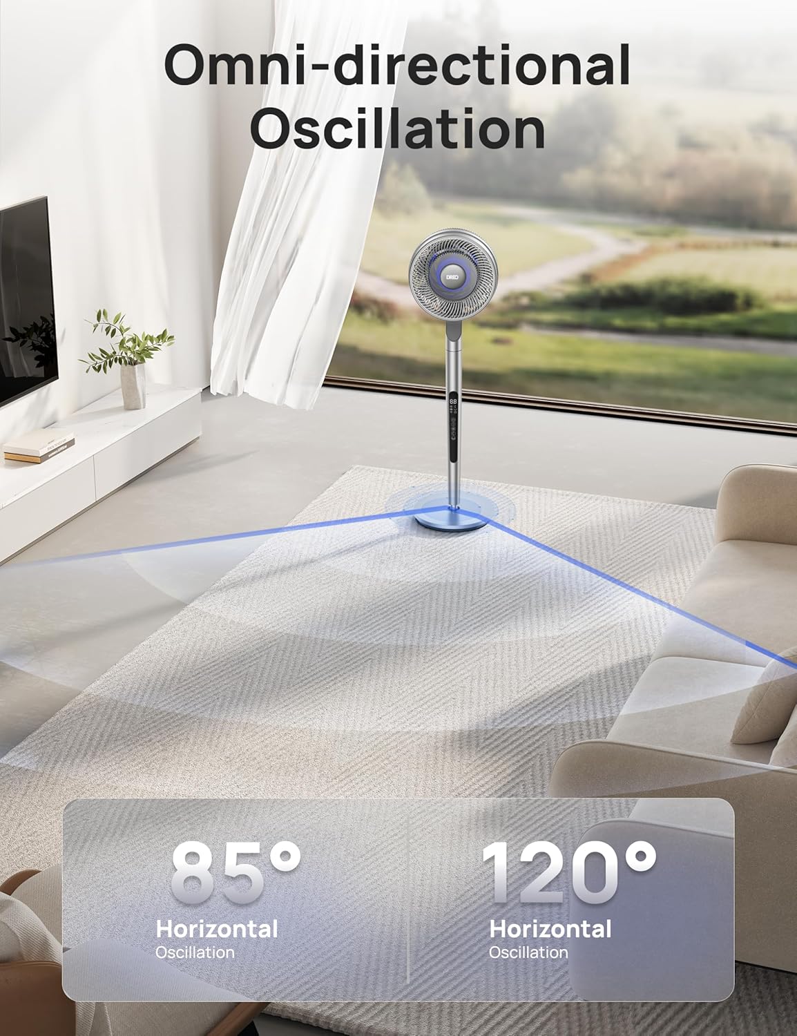 𝘾𝙪𝙨𝙩𝙤𝙢𝙞𝙯𝙚𝙙 𝘾𝙤𝙤𝙡𝙞𝙣𝙜 𝙛𝙤𝙧 𝙔𝙤𝙪𝙧 𝙋𝙧𝙚𝙛𝙚𝙧𝙚𝙣𝙘𝙚: With 6 airflow modes and 10 speed options, this standing fan caters to various cooling needs, from a soft zephyr to a powerful gust. This 120°+85° Omni-Directional lets you direct the cool air to your desired spot in the room.