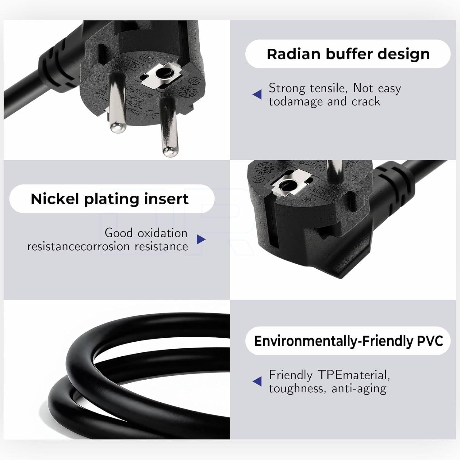 he DRRI Europe Schuko Plug CEE 7-7 Plug 16A 250V to IEC 60320 C19 Power Cord is an essential accessory for connecting server and networking equipment to a power strip in a data rack. With a length of 1.8 meters (approximately 6 feet), it offers ample reach for various setups.Featuring a Europe CEE7/7 Schuko plug on one end and an IEC60320 C19 female connector on the other, this power cord ensures compatibility with a wide range of devices. The cord is built with H05VV-F3G1.5mm² 3Cord, which provides excellent durability and reliability. Its amp rating of 16A and voltage rating of 250V make it suitable for high-power applications.The power cord’s construction is sturdy and long-lasting, designed to withstand the demands of continuous use in server rooms and data centers. It effectively connects servers, PDU, UPS, and other networking equipment to a power source, ensuring a stable and secure connection.The design and quality of this power cord make it a reliable choice for any professional setting. It provides a secure fit and maintains optimal performance, reducing the risk of power interruptions. This power adapter extension cable is an ideal solution for those looking to enhance their data rack setup.The DRRI Europe Schuko to C19 Power Cord offers a dependable and efficient way to connect and power your essential equipment. Its robust build and excellent performance make it a top choice for server and networking applications.