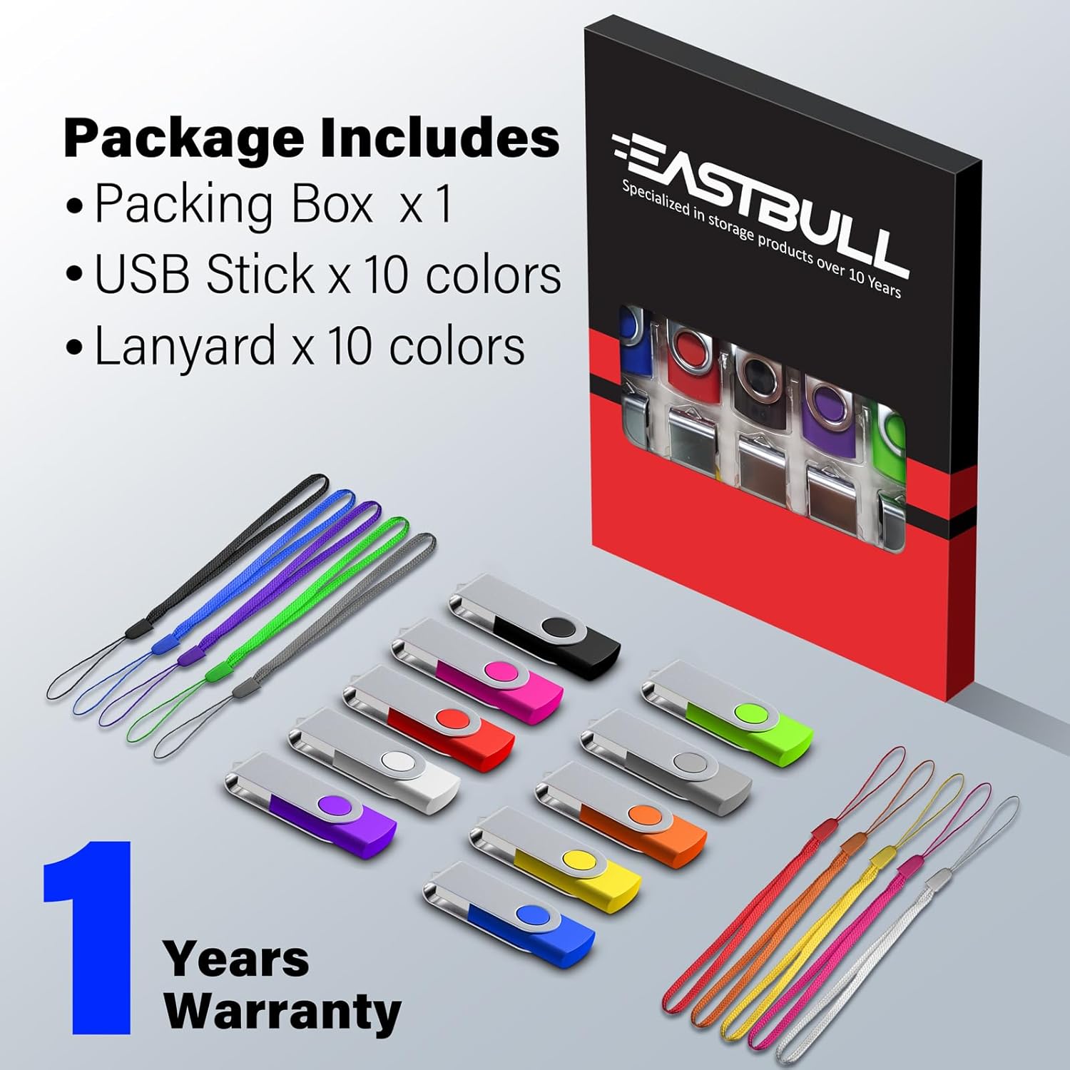 EASTBULL Memory Stick 128MB USB 10Pack, USB 2.0 Thumb Flash Drives Swivel Design Pen Memory Stick Fold Storage (10 Mixed Color With Lanyard)