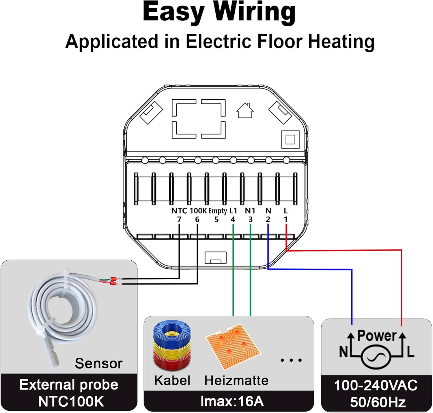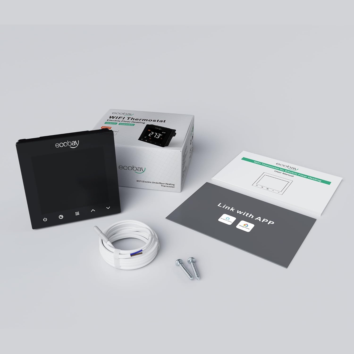 ECOBAY WIFI Thermostat for Electric Floor Heating: Compatible with Electric Mats and Cables, 240V 16A, Floor Protection Mode, Includes 100K NTC Sensor