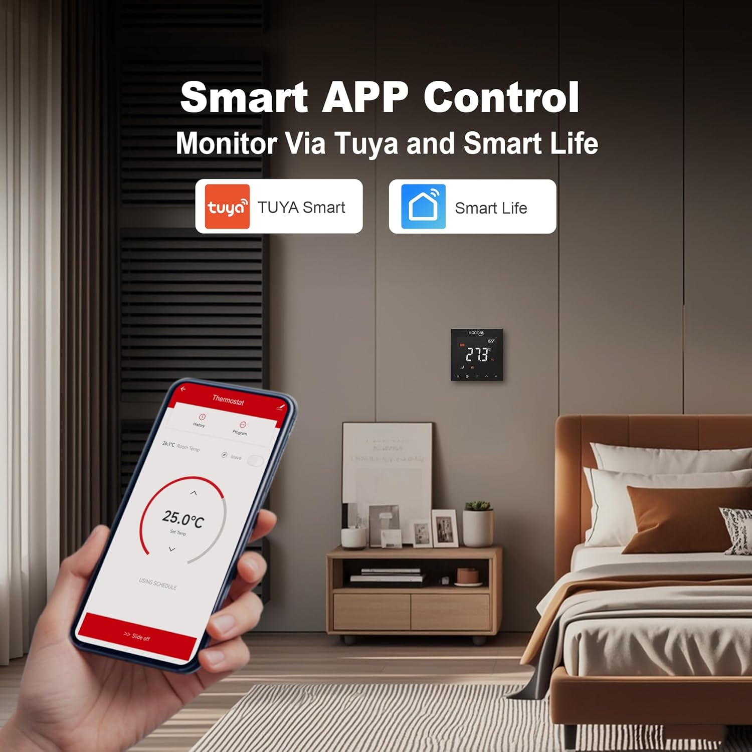 Smart APP and Voice Control – Seamlessly integrate with Tuya Smart, Smart Life, Google Home, and Alexa for convenient app access and hands-free voice control. Easily manage your heating system from anywhere in your home, making your devices a truly smart solution.
