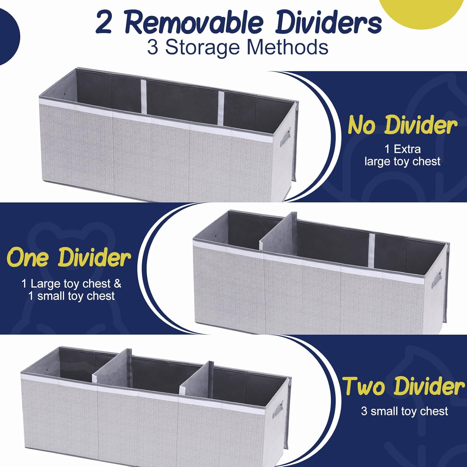 🍀【Multi-Purpose】The dividers seperate our toy box into three deep compartments, switch chaos to order, and you also can remove the dividers to use it as a whole. It is also great for books, baby clothes, blankets storage