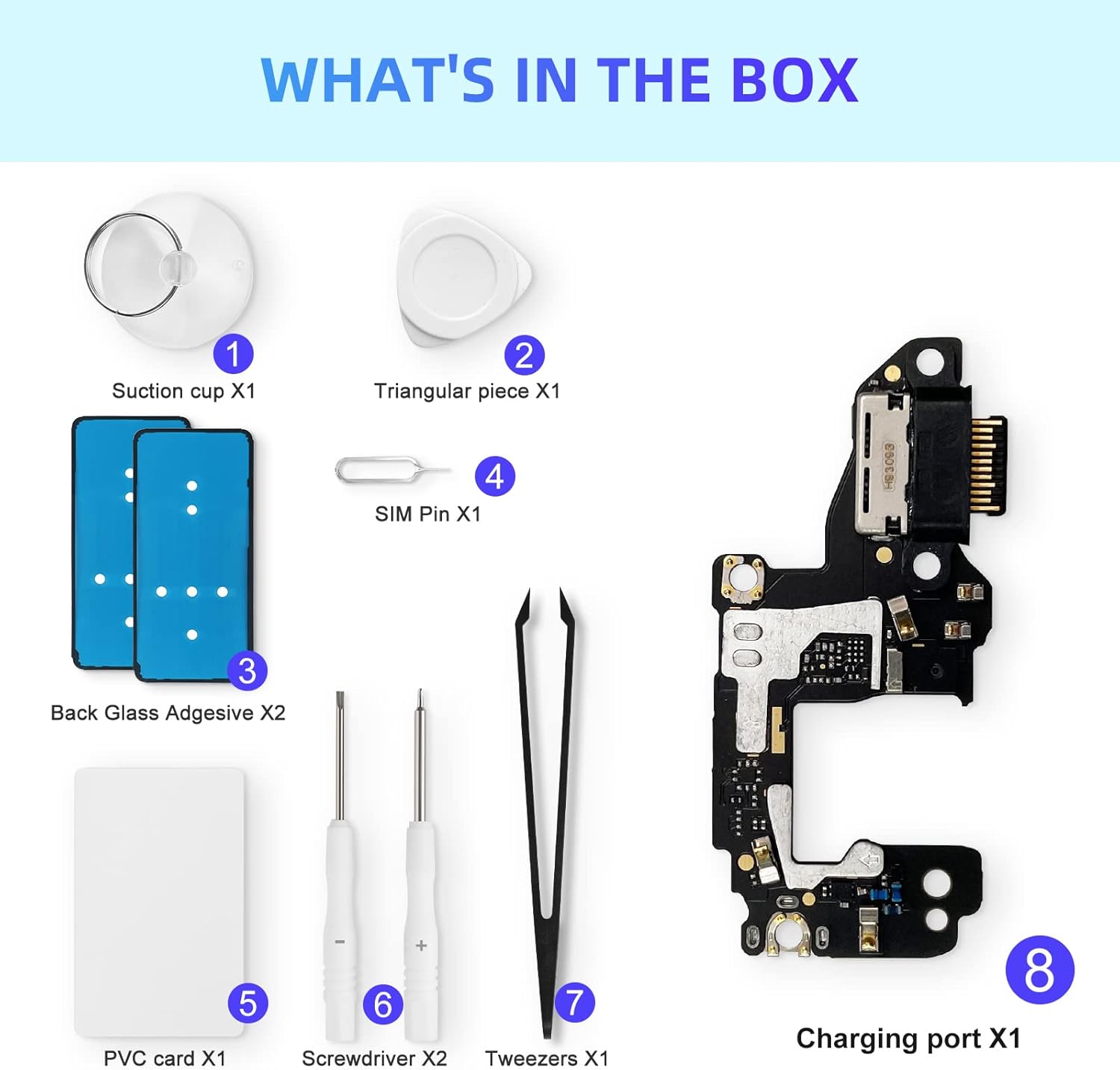 Professional DIY disassembly tool set, effectively disassemble the charging port (1*SIM card pin, 1*suction cup, 1*thin PVC separation card, 1*anti-static tweezers, 1*Phillips screwdriver, 1*slotted screwdriver, 2*back cover glue).