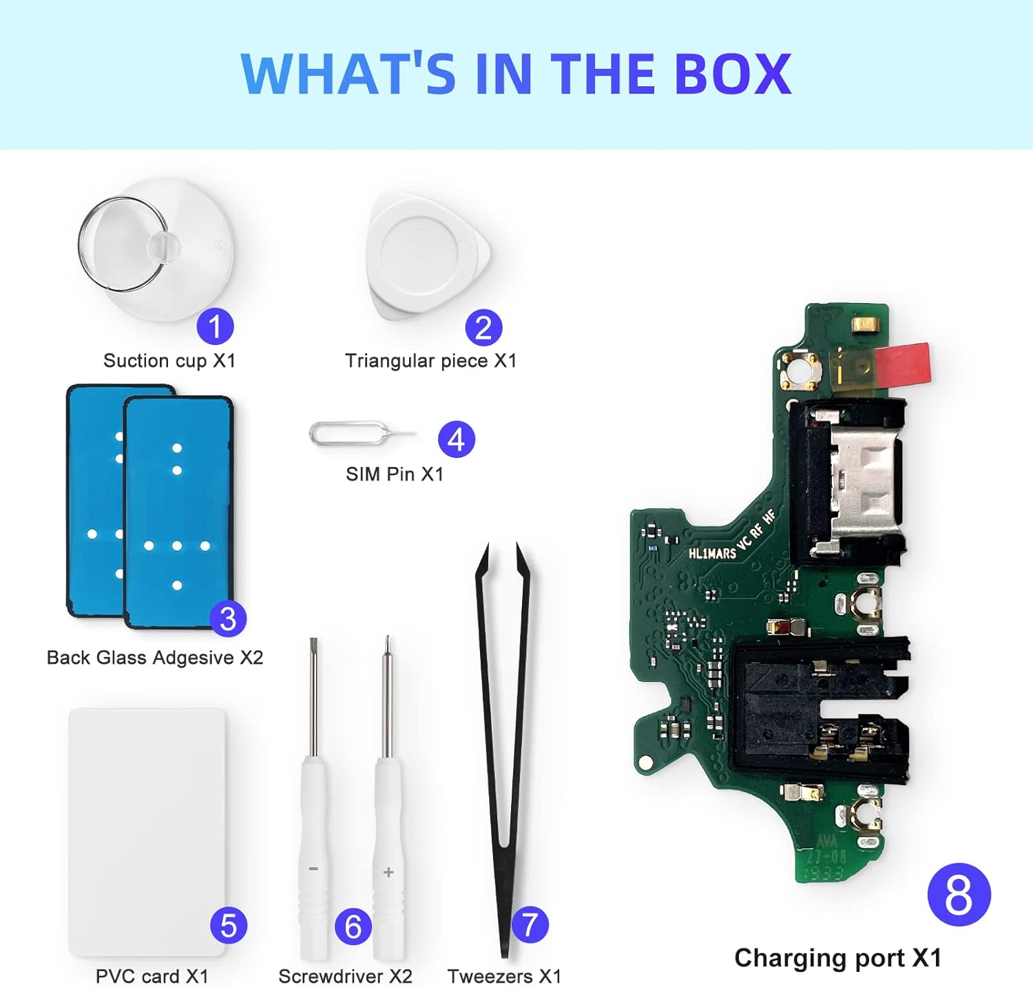 Professional DIY disassembly tool set, effectively disassemble the charging port (1*SIM card pin, 1*suction cup, 1*thin PVC separation card, 1*anti-static tweezers, 1*Phillips screwdriver, 1*slotted screwdriver, 2*back cover glue).