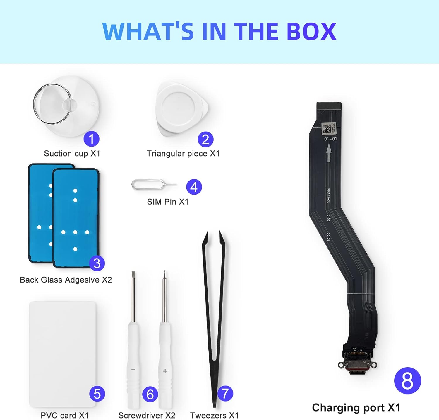 Professional DIY disassembly tool set, effectively disassemble the charging port (1*SIM card pin, 1*suction cup, 1*thin PVC separation card, 1*anti-static tweezers, 1*Phillips screwdriver, 1*slotted screwdriver, 2*back cover glue).