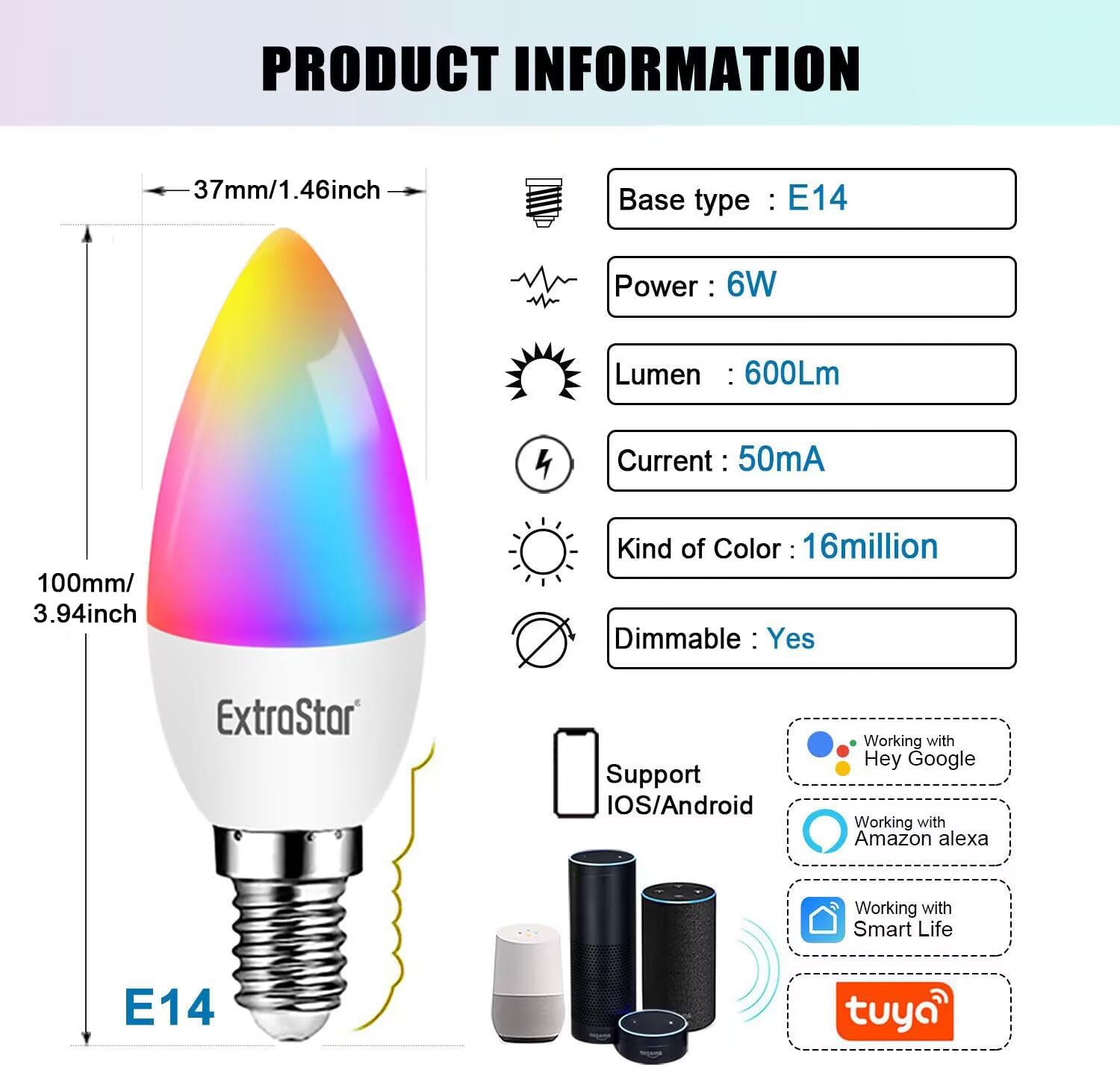 EXTRASTAR E14 Smart Bulb, Alexa Light WiFi LED Candle Bulbs C37, 6W 600lm, WiFi RGB Color Dimmable Multicolor + Warm or White Light, Compatible with Alexa and Google Home, 1 Count