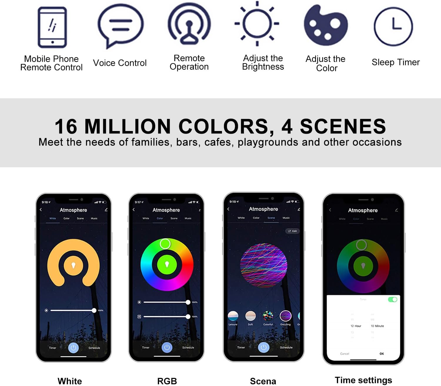 【Multicolor Light Bulb】: Designed with over 16 million colors, DIY scenes, and schedule function. Switch to the desired light mode to suit your mood and adjust the brightness to meet your needs.