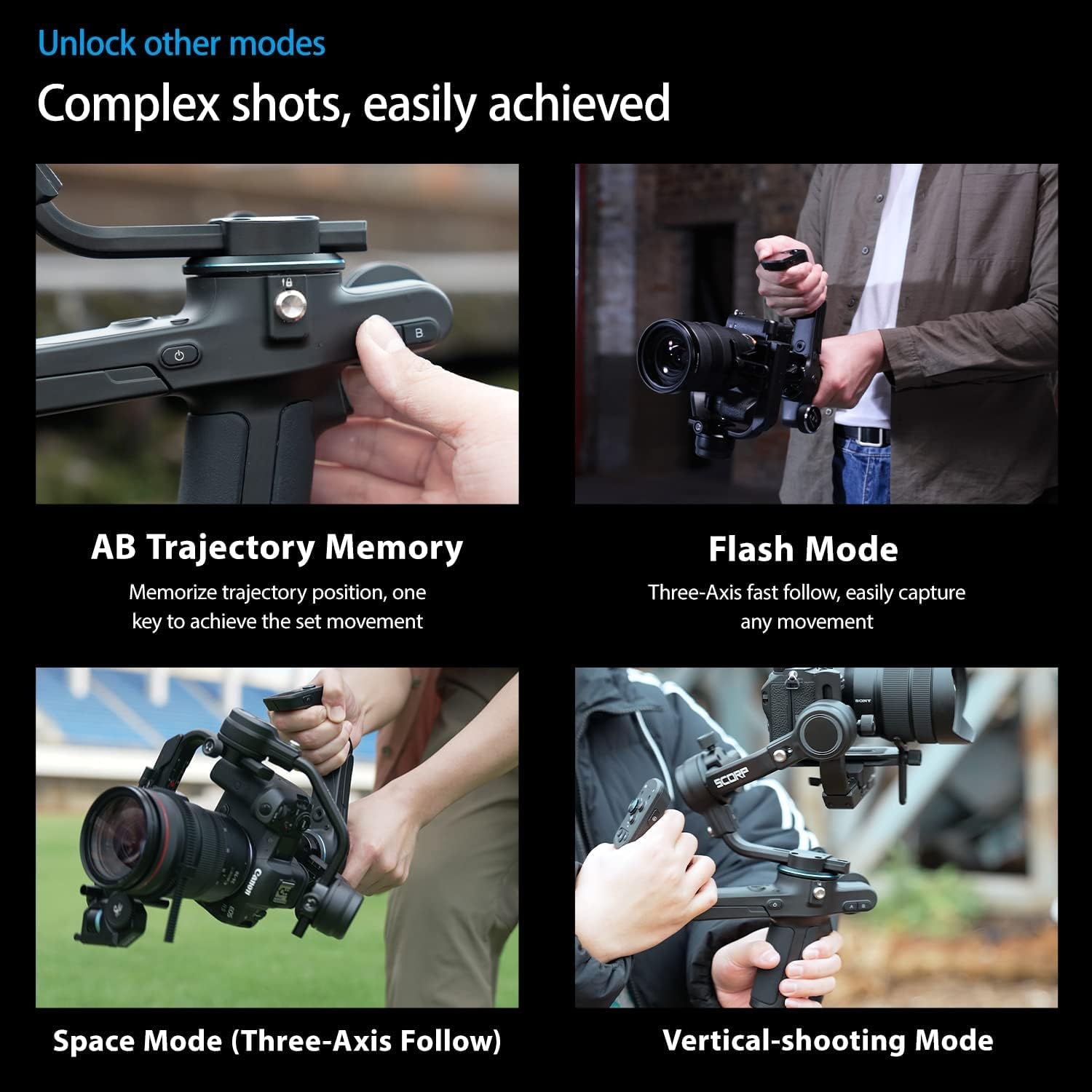 【Lightweight Design】The body of SCORP-C 3-Axis Gimbal Stabilizer is made of macromolecular resin and aluminum alloy, making the camera gimbal light and looks great.Lightweight design brings more flexibility to your shooting process.