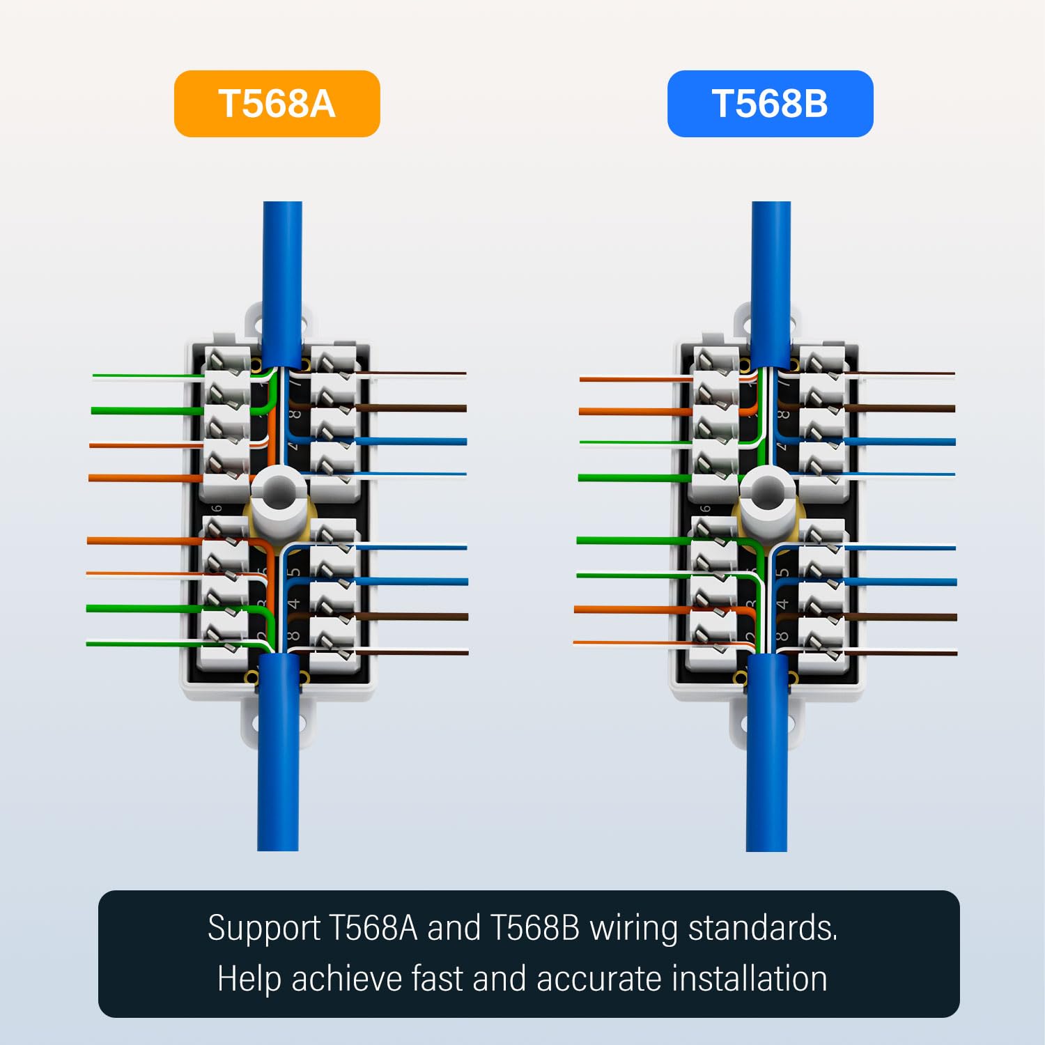 The mode of wiring: 23 To 26 AWG.TIA/EIA 568A and 568B wiring pattern