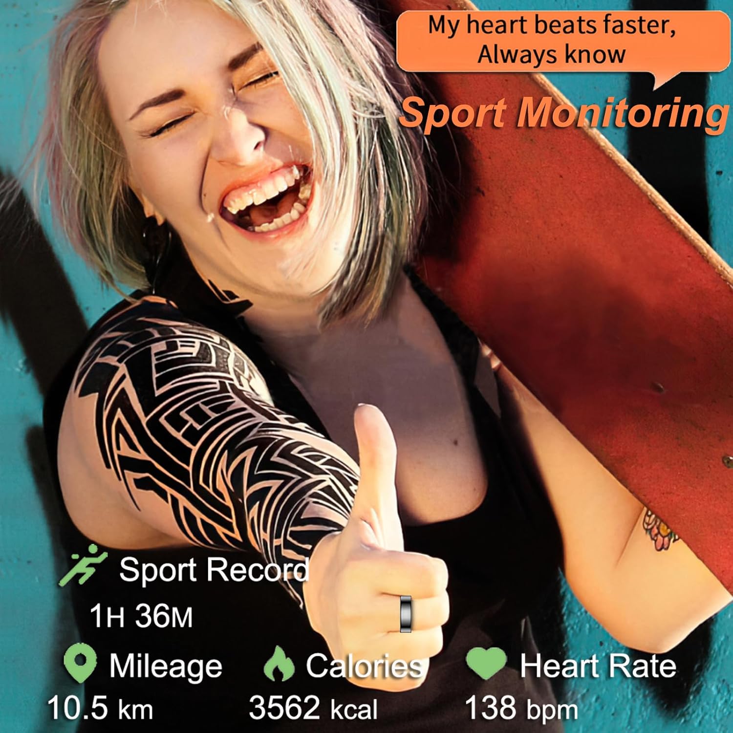 Sport Fitness Ring: Collect everyday steps, calories consumption and distance walked automatically. Turn on the sport modes in the App, it will additionally track your sport route, activity time, and heart art rate during exercise, this allows you know when you should save motivation or keeping exercise hard, also let you know the real-time sport performance.