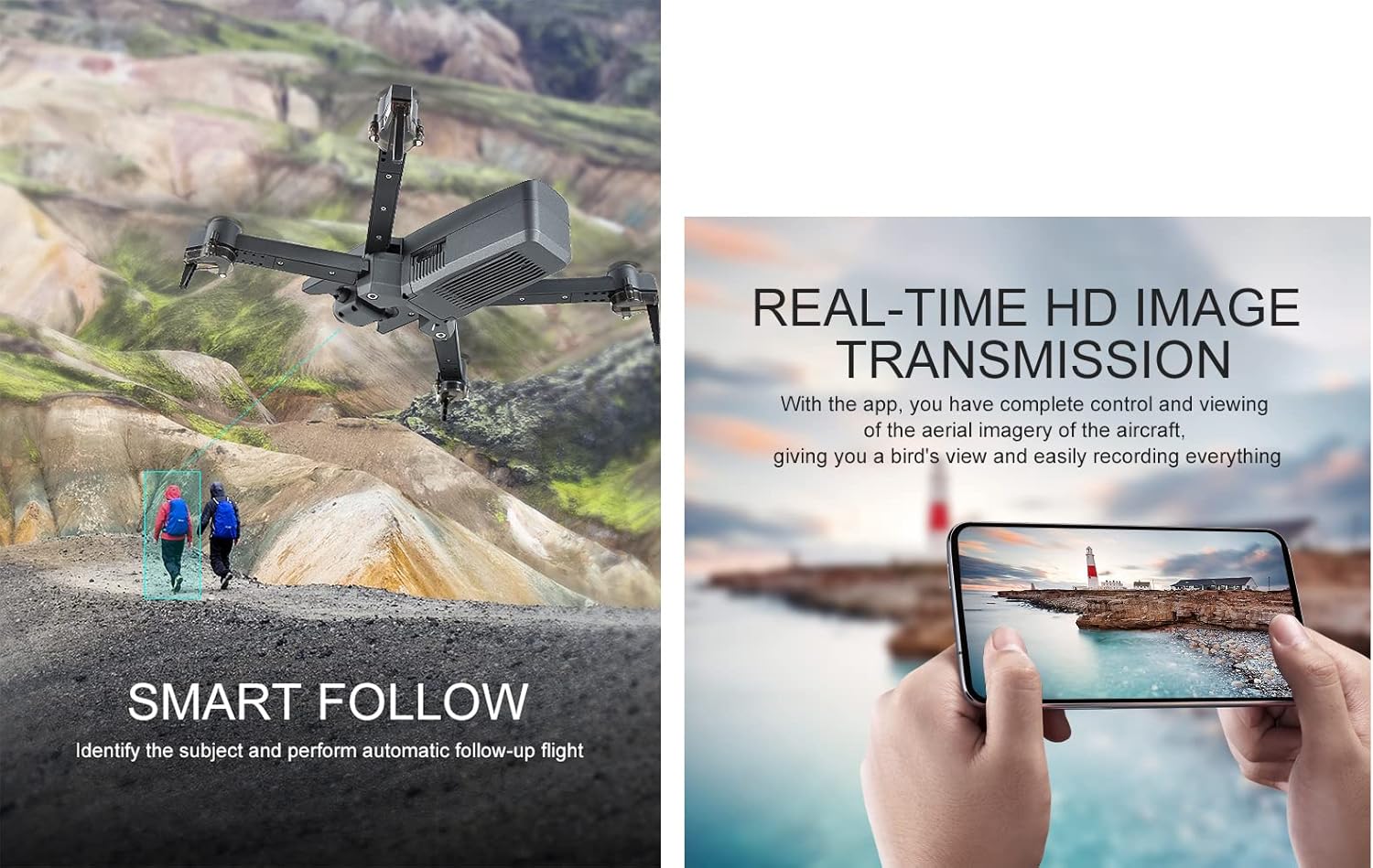 ใREAL-TIME HIGH-DEFINITION IMAGE TRANSMISSIONใ: through the APP, you can fully control and watch the aerial images of the aircraft,Gives you a view of migratory birds and records everything with ease. Intelligent follow, identify the subject and automatically follow the flight.