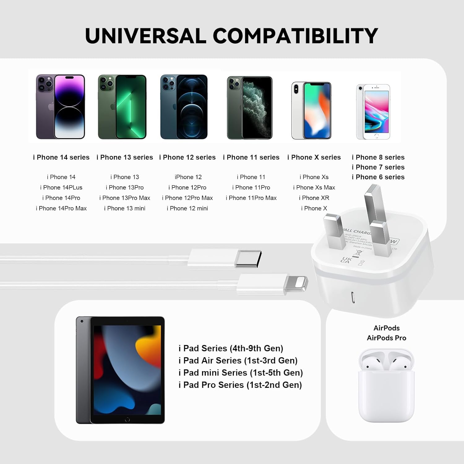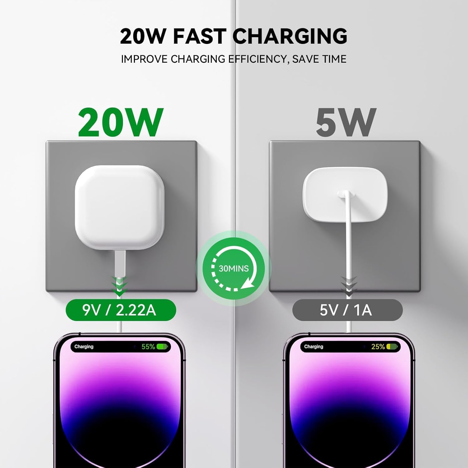 Wide Device Compatibility: The 20W PD wall chargers are compatible with i-Phone 14/14 Plus/14 Pro/ 14Pro Max/13/13 Mini/13 Pro/13 Pro Max/12/12 Mini/12 Pro/12 Pro Max/SE 2020/11/11 Pro/11 Pro Max/XS/XS Max/XR/X/8/8 Plus/7/7 Plus/6s/6s Plus/6/6 Plus/SE/5s/5/5c, iPad mini/iPad air/iPad