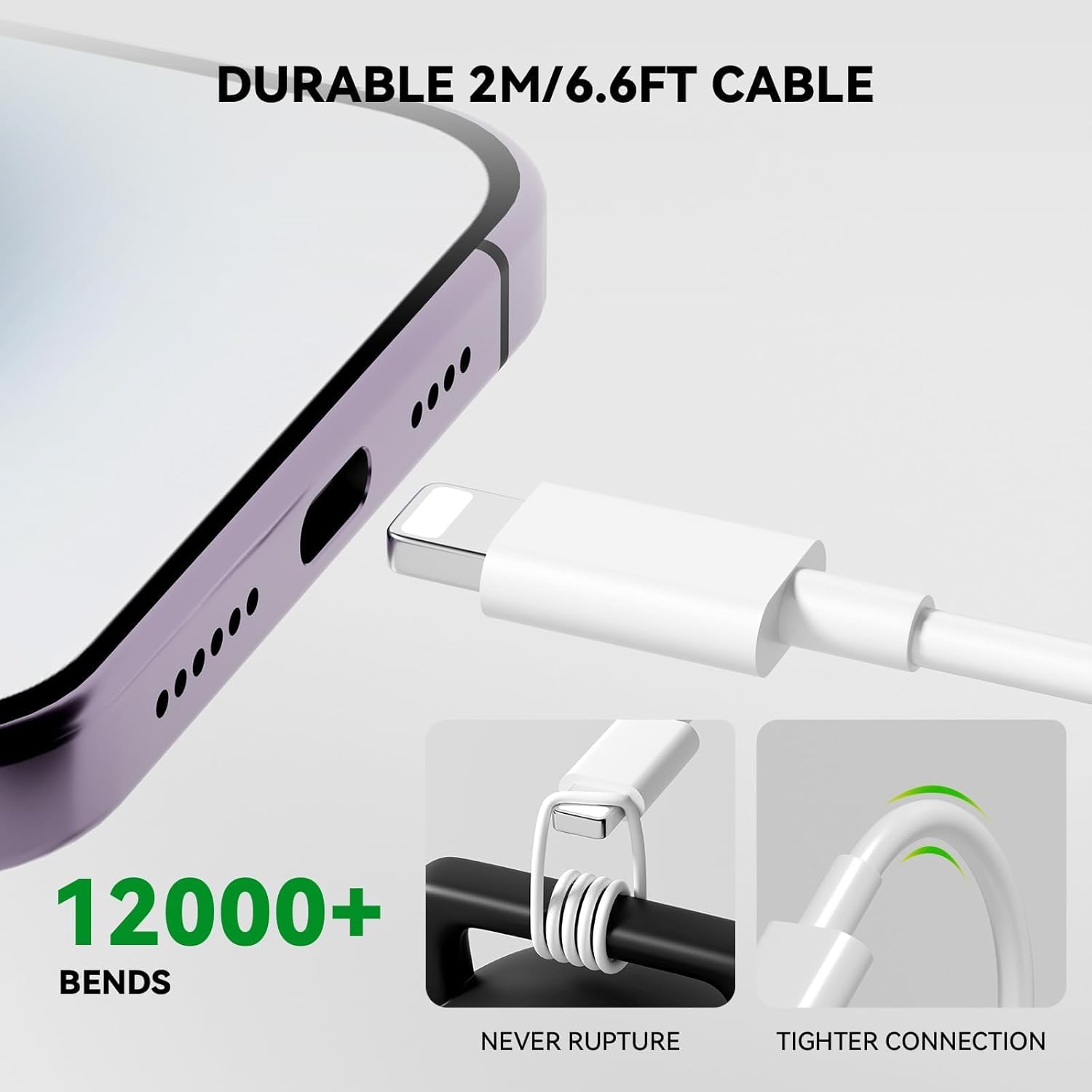 Durable 2M/6.6FT Cable: The premium 6.6ft USB C to Lightning cable is designed to withstand over 12000 bends, offering long-lasting durability. Built-in smart chip ensures optimal power delivery for fast and stable charging, while the tangle-free design makes storage easy