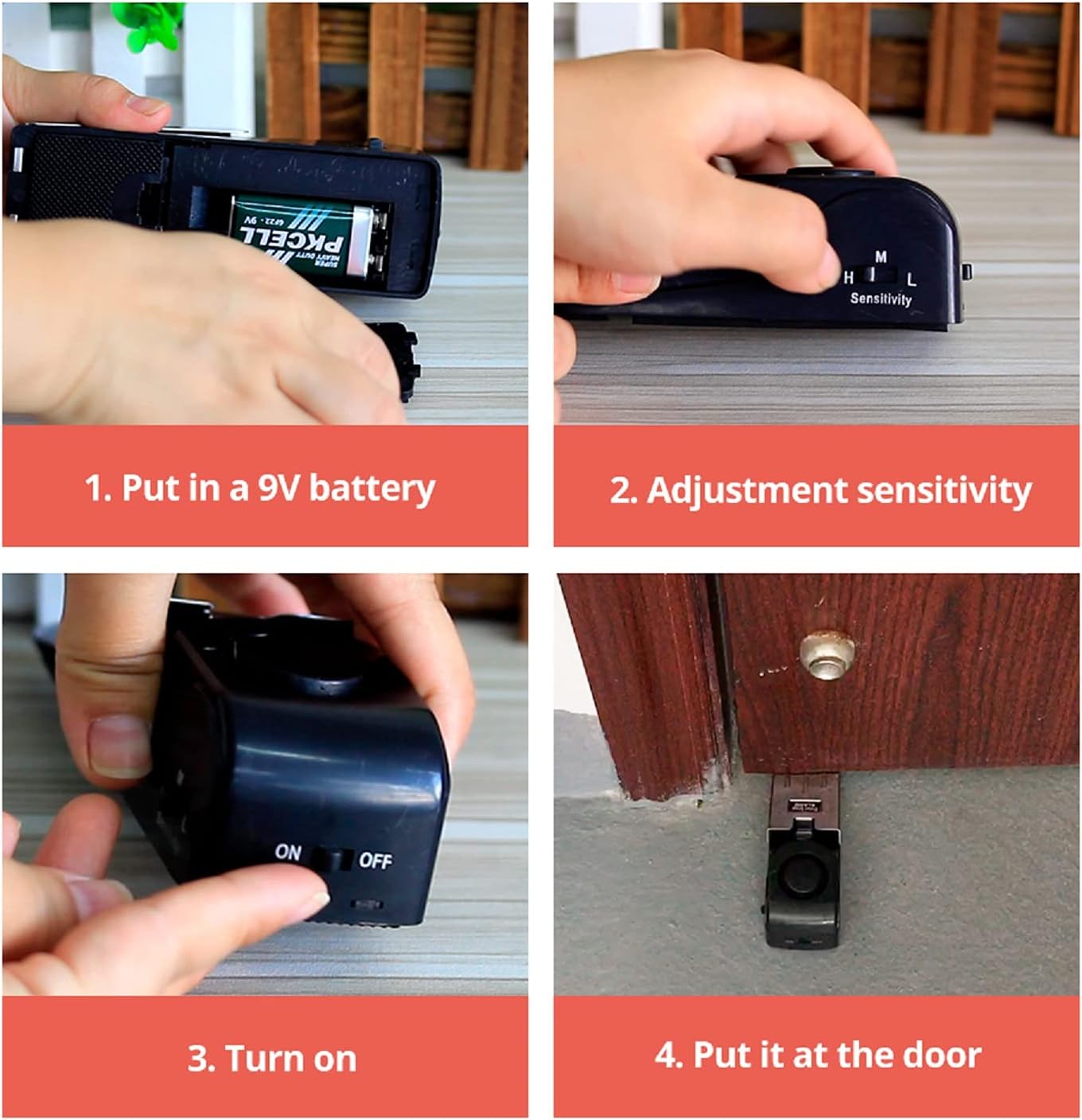【Adjustable Sensitive Levels】Adjust sensitivity of the door stop alarm-Low, Medium and High. Choose levels according to your need. Set high level when you are sleeping and you will know subtle differences of your door and get a peace of mind.