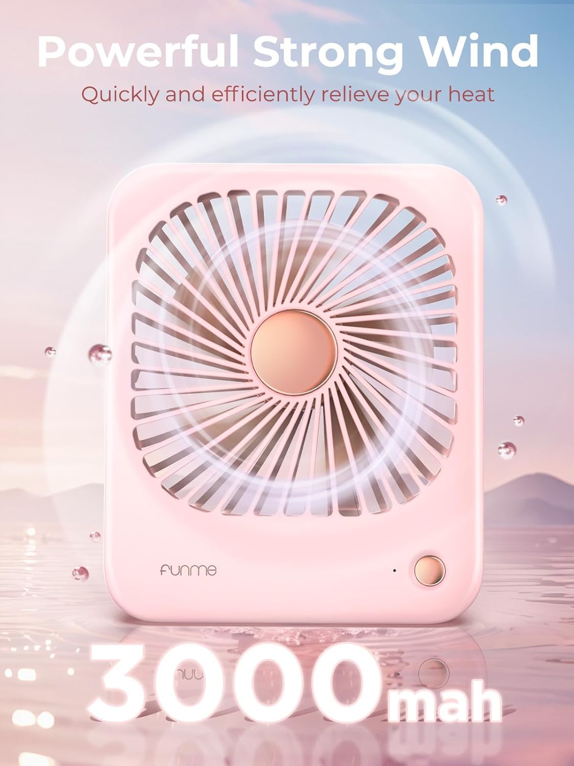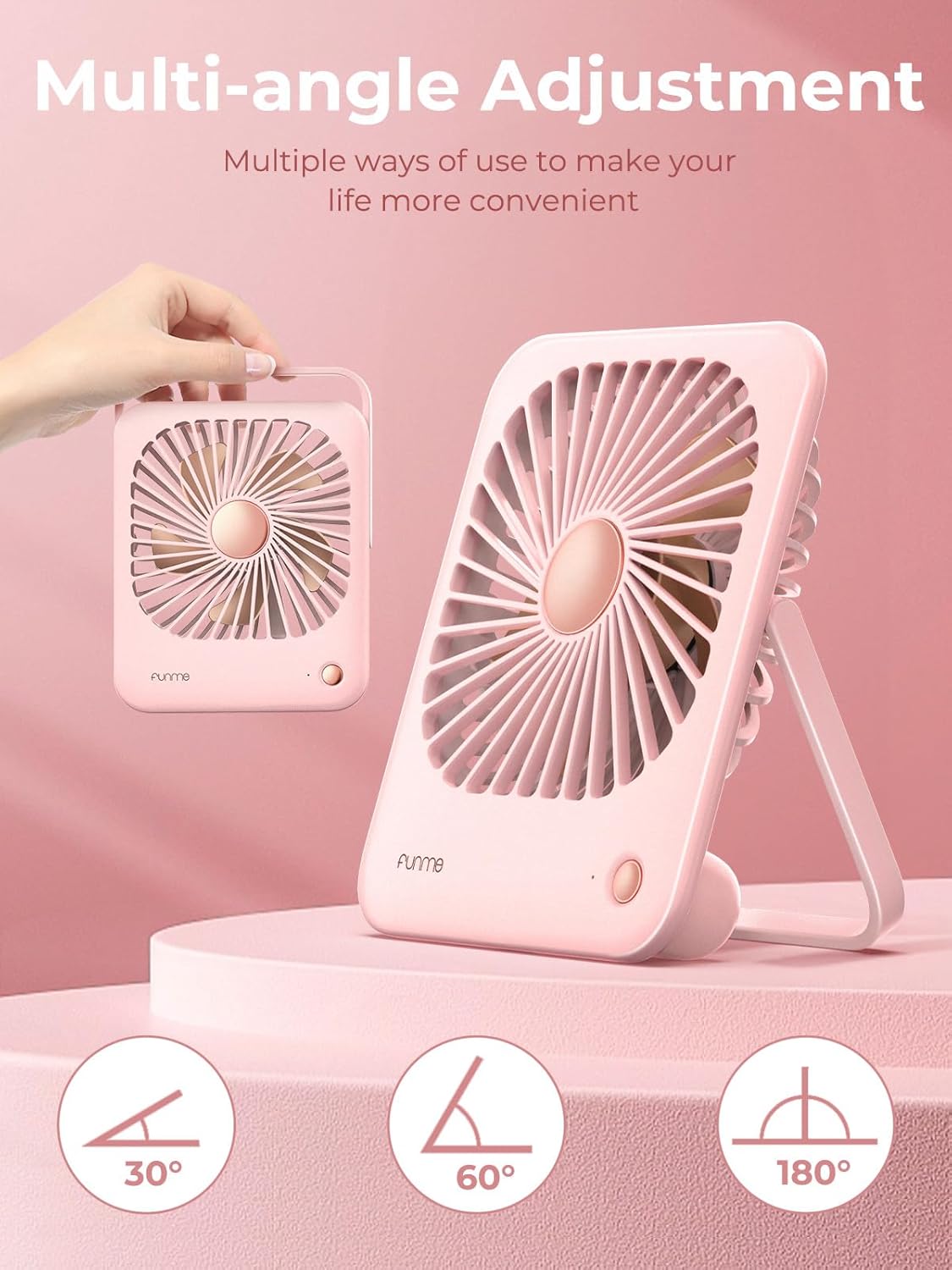⛱️【Small & Portable Size】Funme Upgraded Pink small Quiet Desk fan portable adopts a mini size of 13.5*3.45*16.4cm design, weighing only 225g, and also has a convenient 180°Foldable design, easy to store, cordless design, lighter, thinner and more portable, carry it with you when you go out, and enjoy the cool breeze anytime, anywhere.