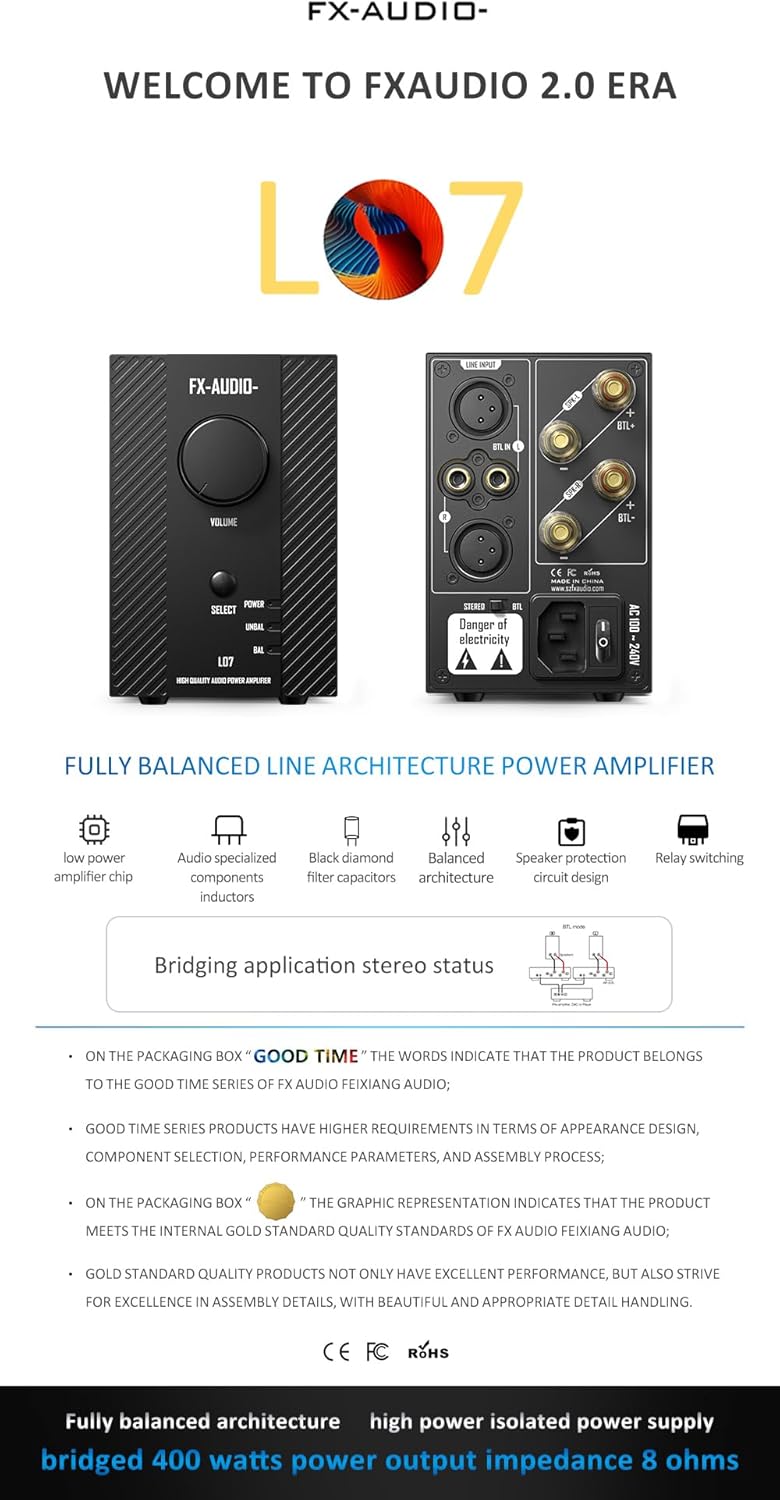 FX-AUDIO- L07 Fully balanced line architecture power amplifier Small body big energy ,frosted solid aluminum knob Can be combined with multi-channel high-power home theater system Fully balanced architecture, left and right channel separation is higher, the sound is cleaner low-power chip, can continue to work for a long time without heat, catching up with dramas, playing games more at ease 400 watts output, can drive large caliber speakers, more control, in the big dynamic can still be stable output, so that the atmosphere is more active! L07 Technical Parameters Chipset: MA5332MS Power output: LR 100W+100W@8Ω, 200W+200W@4Ω @1kHz THD+N <10% BTL 400W@8Ω,@1kHz THD+N <10% Distortion ≤ 0.008% SNR: 98dB Frequency Response Range: 10Hz-24kHz ± 0.3dB Interface Input:1xRCA input, 1x Balanced XLR Output: R/L Speaker Out
