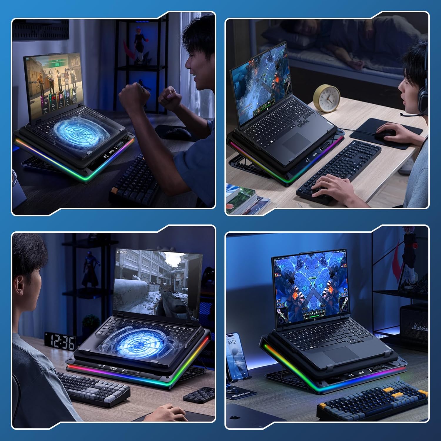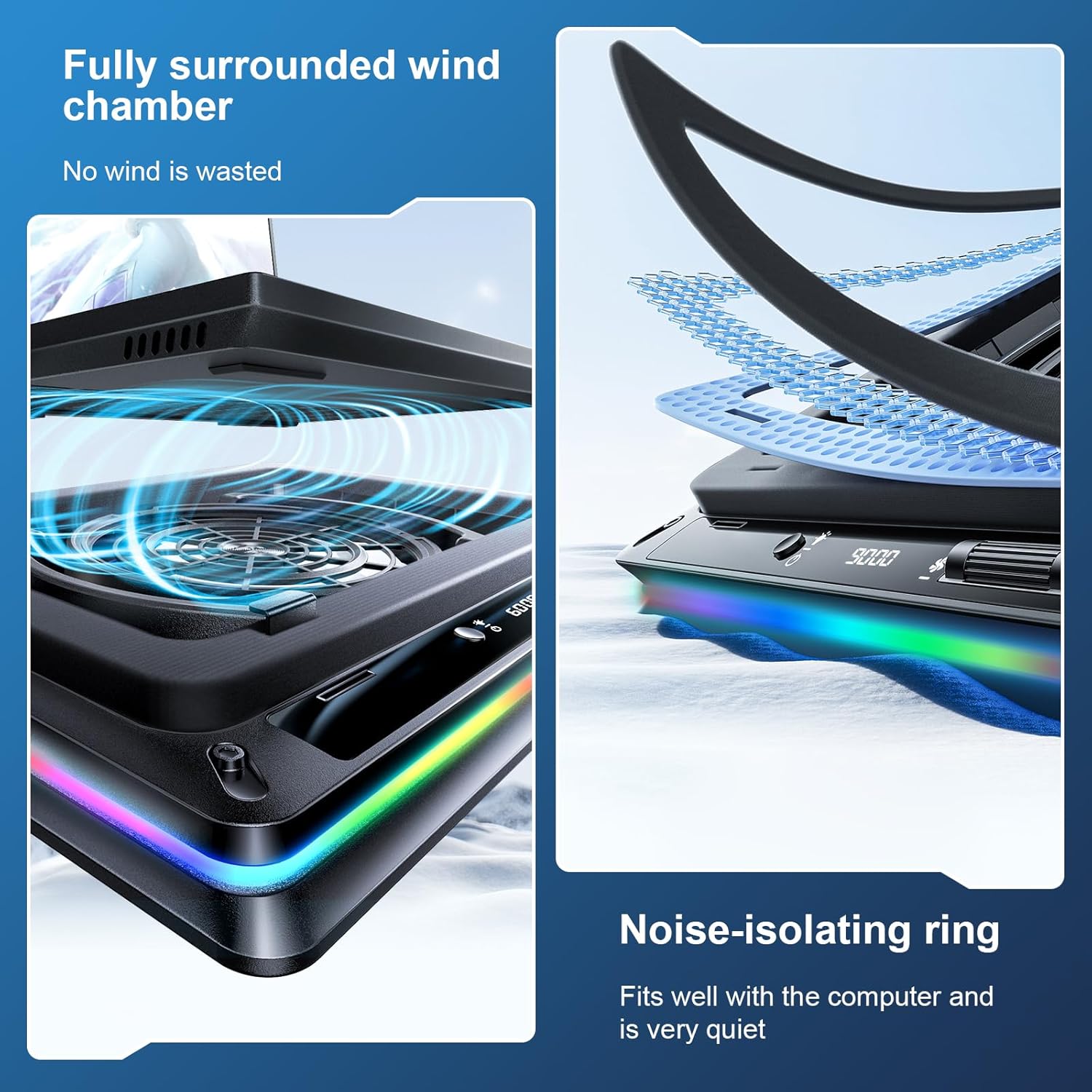 18CM Industry-leading High-efficiency Cooling Fan: Our newly upgraded laptop cooling pad is equipped with a 7-inch (18CM) large-diameter turbocharged external fan, which achieves a significant 38℃ (100℉) temperature drop in a few minutes, allowing for continuous and rapid cooling