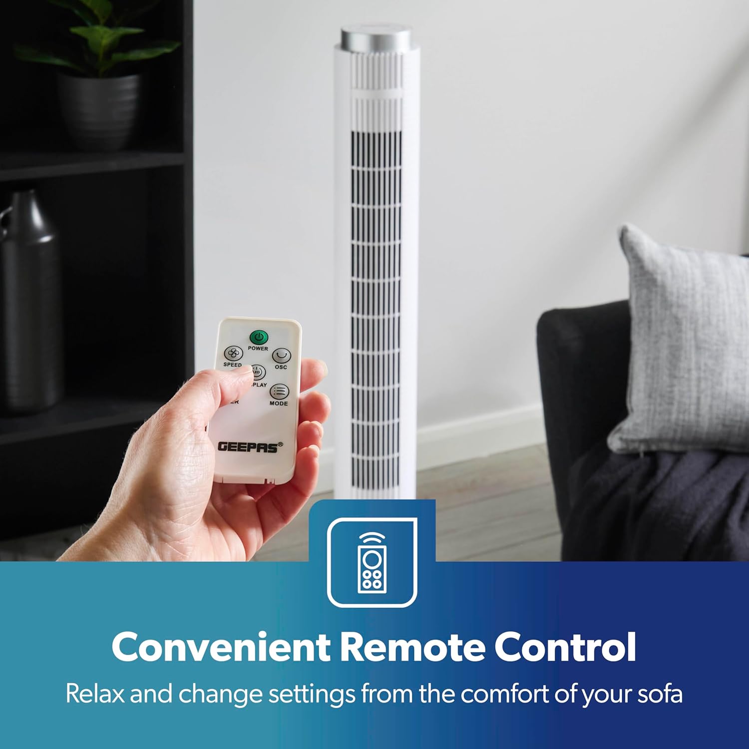 The GEEPAS 42″ Tower Fan is a sleek, space-saving cooling solution thatâs ideal for home offices or bedrooms. At 42″, itâs not quite as tall as a pedestal fan, but it hits the sweet spot for personal comfortâespecially in smaller spaces.Setup is straightforward, and the built-in plug holder is a thoughtful touch that makes storage tidy and hassle-free. The wide-angle oscillation does a great job of circulating air evenly, and the fanâs slim profile means it doesnât dominate the room.With 4 wind modes (Normal, Natural, Sleep, and Child) and 3 speed settings, it offers plenty of flexibility to suit your comfort level. The digital touch panel and remote control make adjustments effortless, whether youâre at your desk or lounging on the sofa.One standout feature is the 12-hour timer and the inclusion of a water tank with ice packsâa clever addition for those extra-hot days. And despite its power, the fan runs quietly at just 58â¯dB, so it wonât disturb your work or sleep.Final verdict: a tidy, efficient fan thatâs been a real boon during warm spells. If youâre after a quiet, energy-efficient cooling option with smart features and a compact footprint, this oneâs well worth considering.