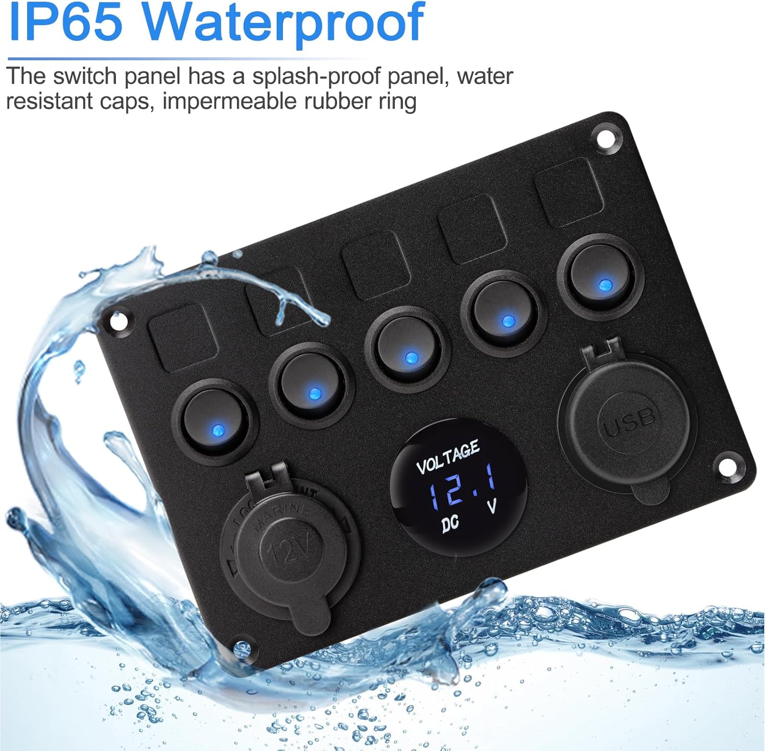 Multifunction Marine Switch Panel: Included 5 Blue LED toggle switches, 12V Lighter Sockets, dual USB charger 5V 2.1A and 12V/24V LED digital voltmeter. Great for circuit control, charging needs and voltage monitoring
