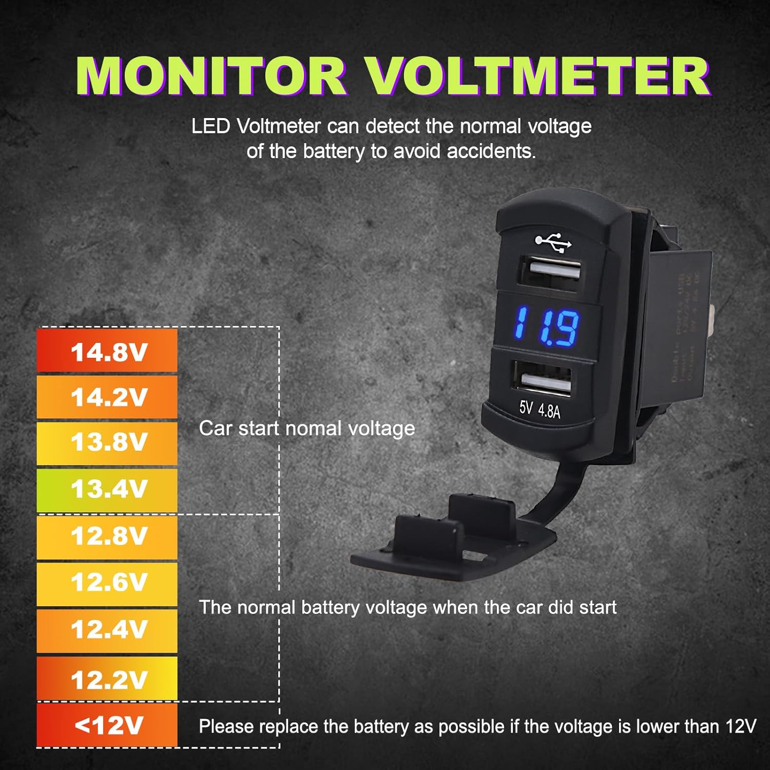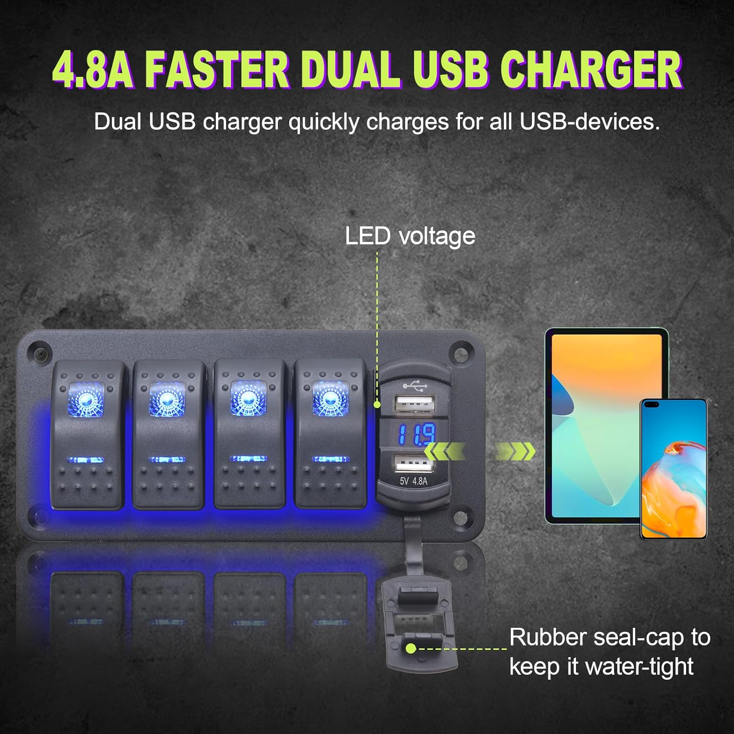 12v switch panel with overheat protection, overload, overcurrent, short circuit protection and multiple protection. Dual USB charger has a total output of 4.8A, and with rubber sealing cap, waterproof.