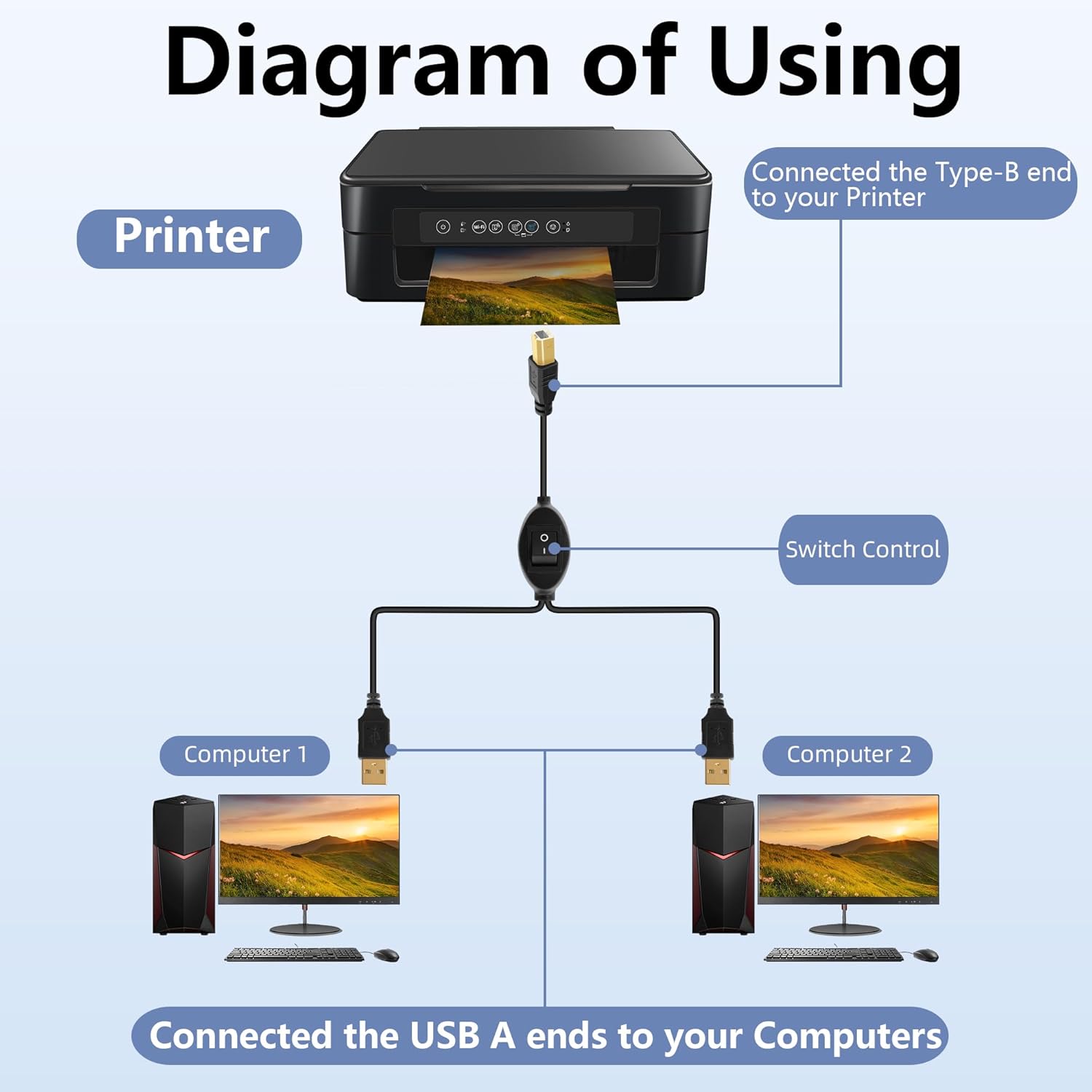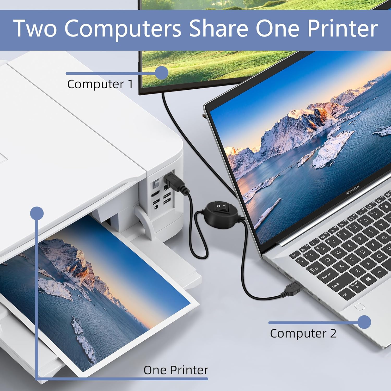Printer Splitter for Two Computers: This cable converts your USB B plug into 2 USB A male port, connects one USB2.0 peripheral device to two Computers or laptop,allowing easy switching with a flick of a switch. Note: Can not be used at the same time.Very useful product if you have two computers