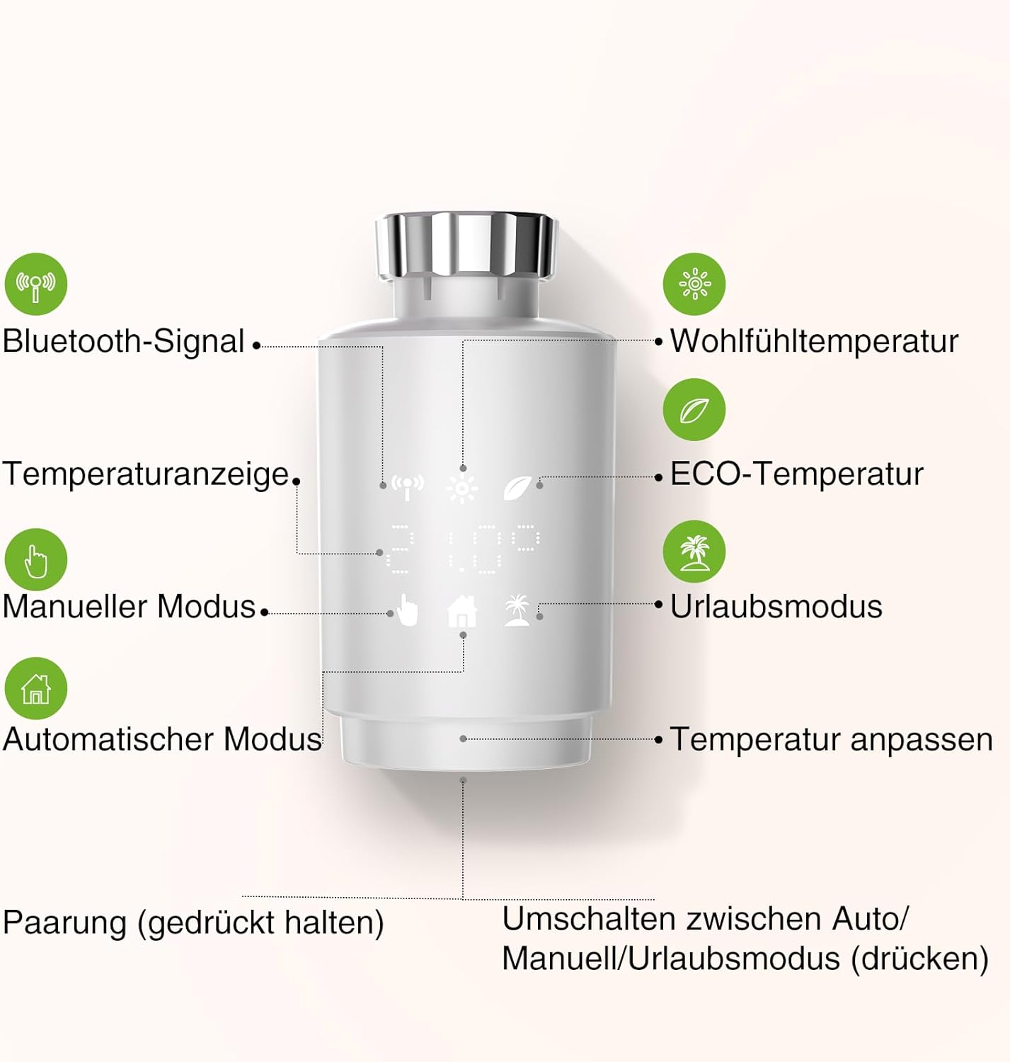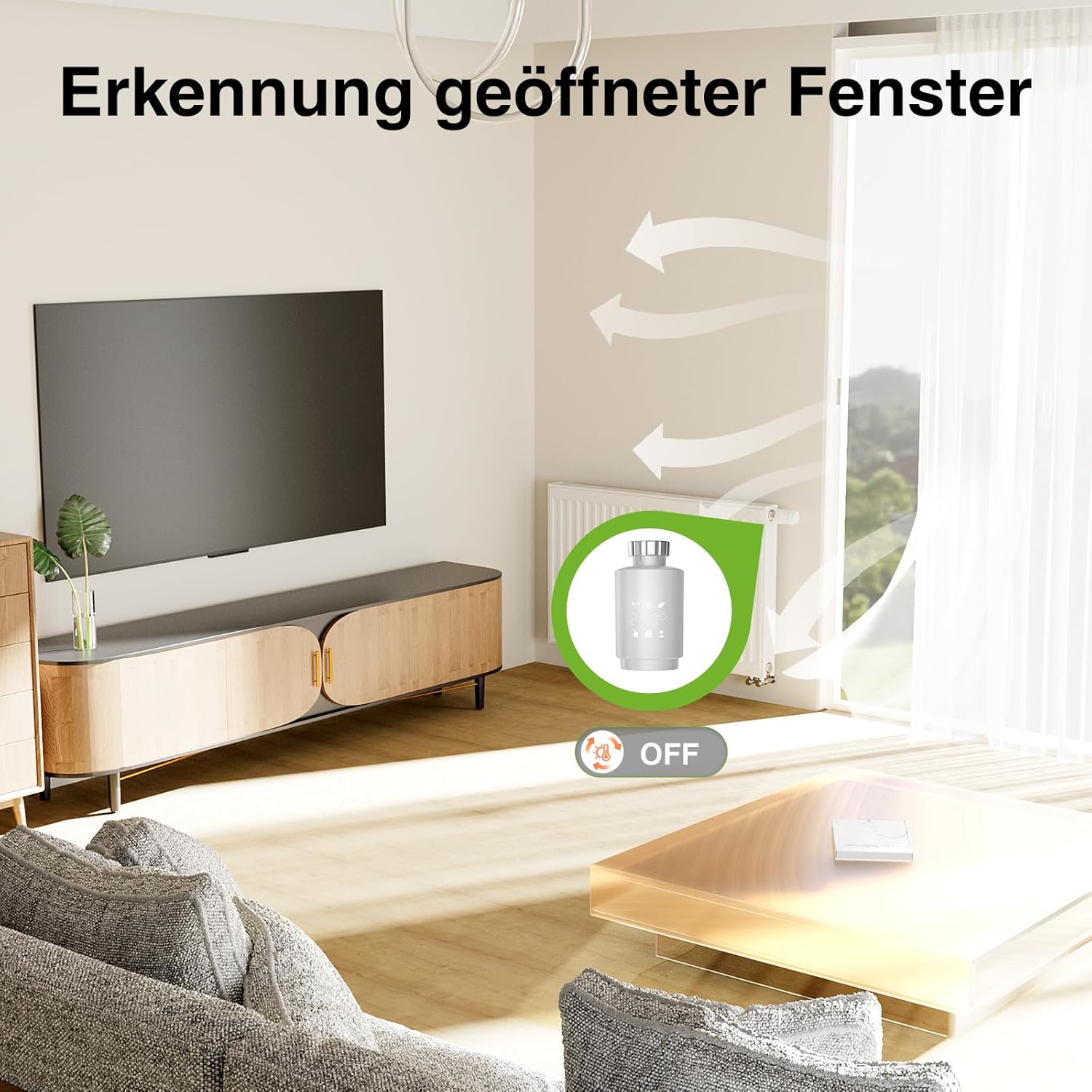 Energy saving – The radiator thermostat can automatically adjust the room temperature based on temperature plans set by the user, thus meeting different requirements in various usage scenarios. By detecting windows, the intelligent radiator thermostat automatically shuts off the heating when doors or windows are open to prevent energy waste. (battery included)