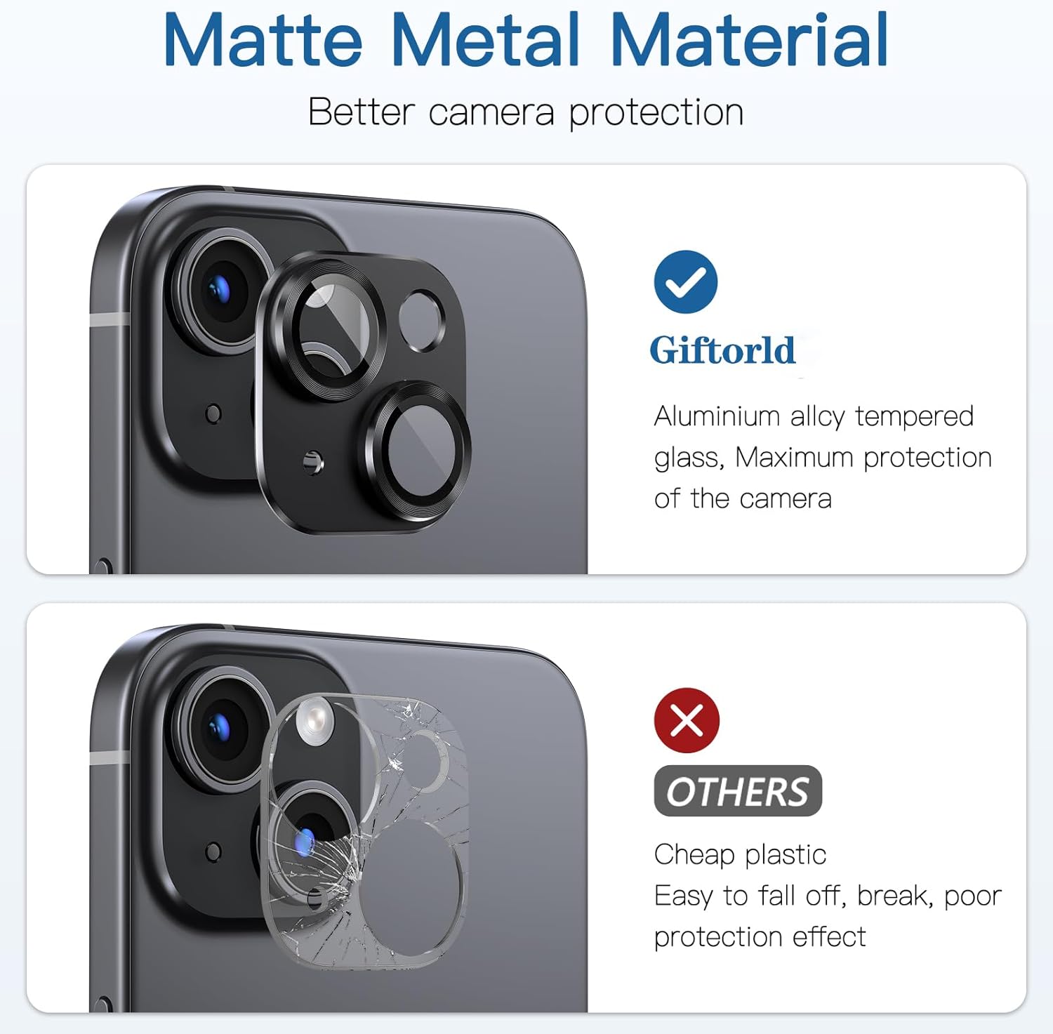 【Upgraded Protection】These lens protector adopts 5 layers unique design, it is made of aviation aluminum and 9H tempered glass,full coverage of the lens,consistently protects your lens screen from scratches, scuffs and impact.Oleophobic layer prevents water, dust, fingerprints. Keep the phone lens in HD transparent and clean all the time.