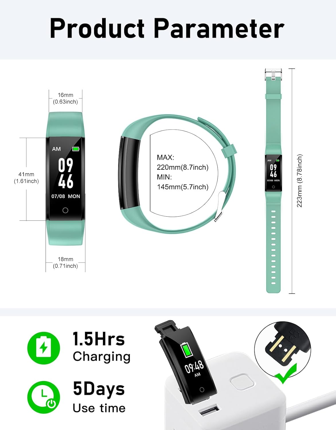 【Long Battery Life】This fitness tracker charged through the built-in USB, enabling quick charging with just a gentle connect. It only takes 2 hours to fully charge and can last up to 5 days on a single charge.