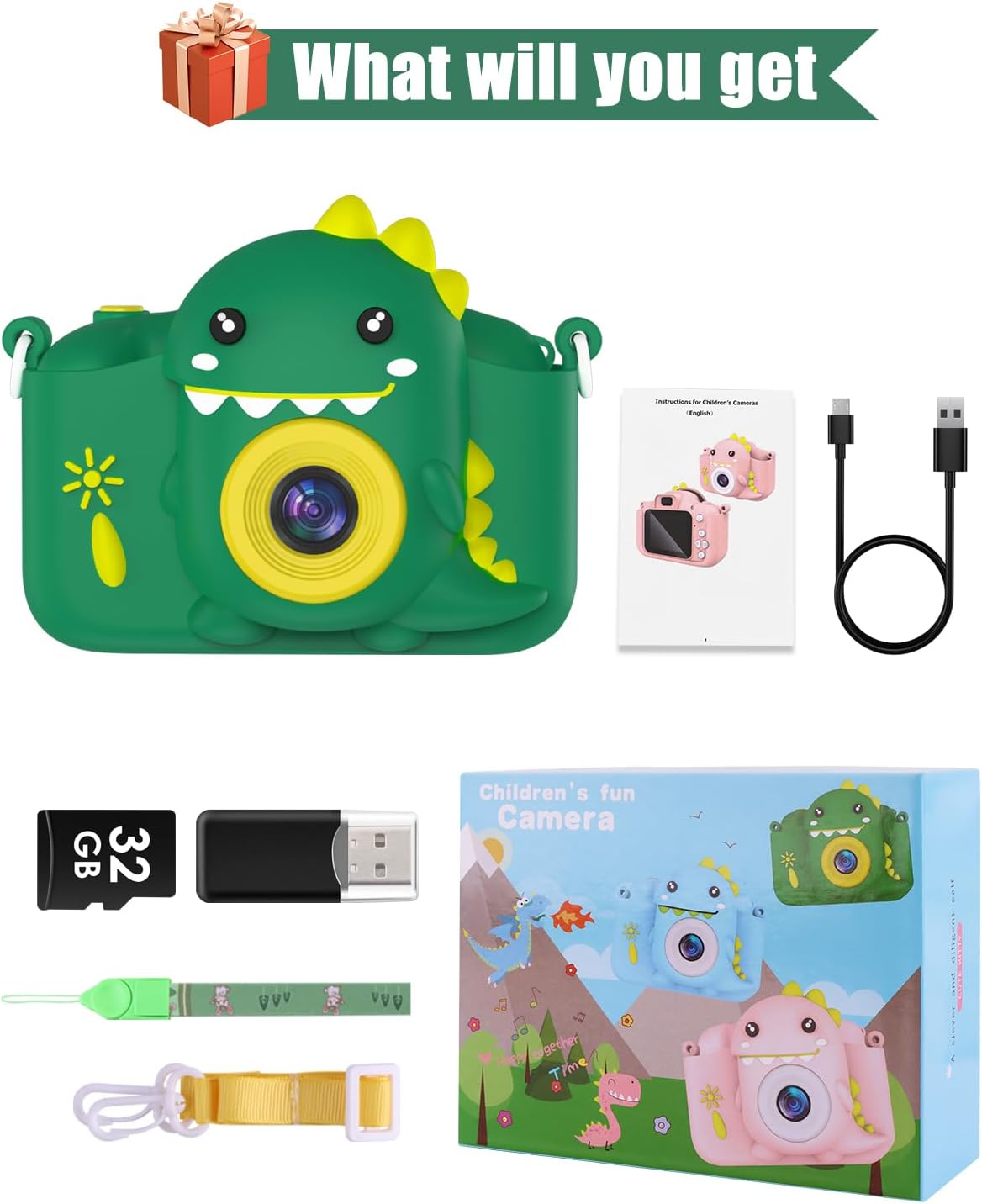 【Large Capacity Lithium Battery & 32GB Memory Card & Card Reader】Our kids camera for girls built-in 1000mAh rechargeable battery.After full charging will work for 3-4 hours, kids can enjoy the fun of taking photos without worried about running out of battery.Children camera with a 32GB Card and card reader to store thousands of photos.