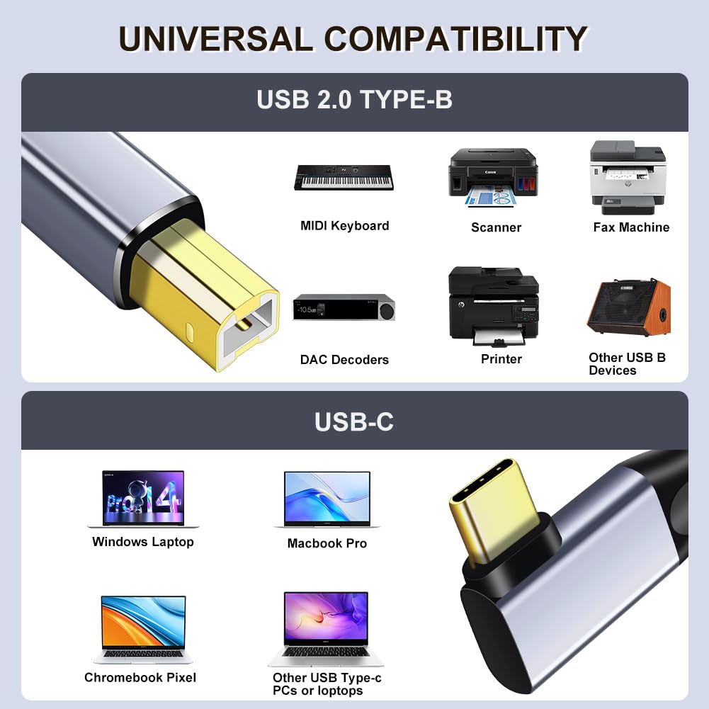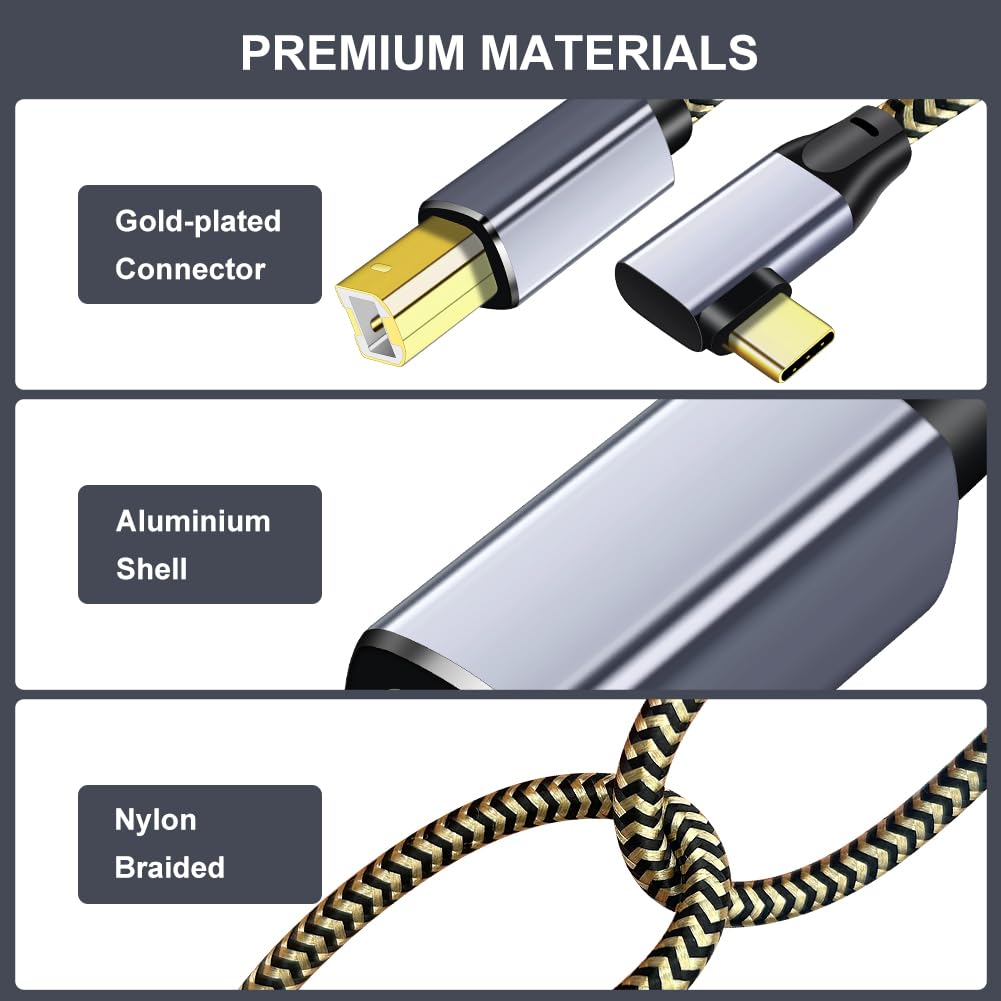 👍【USB C Printer Cable】Right Angled USB C to USB B Male Nylon Braided Scanner Cord Compatible with MacBook Pro/Air, MIDI Cable for Casio Digital Piano MIDI Controller and More Type-C Devices/Laptops