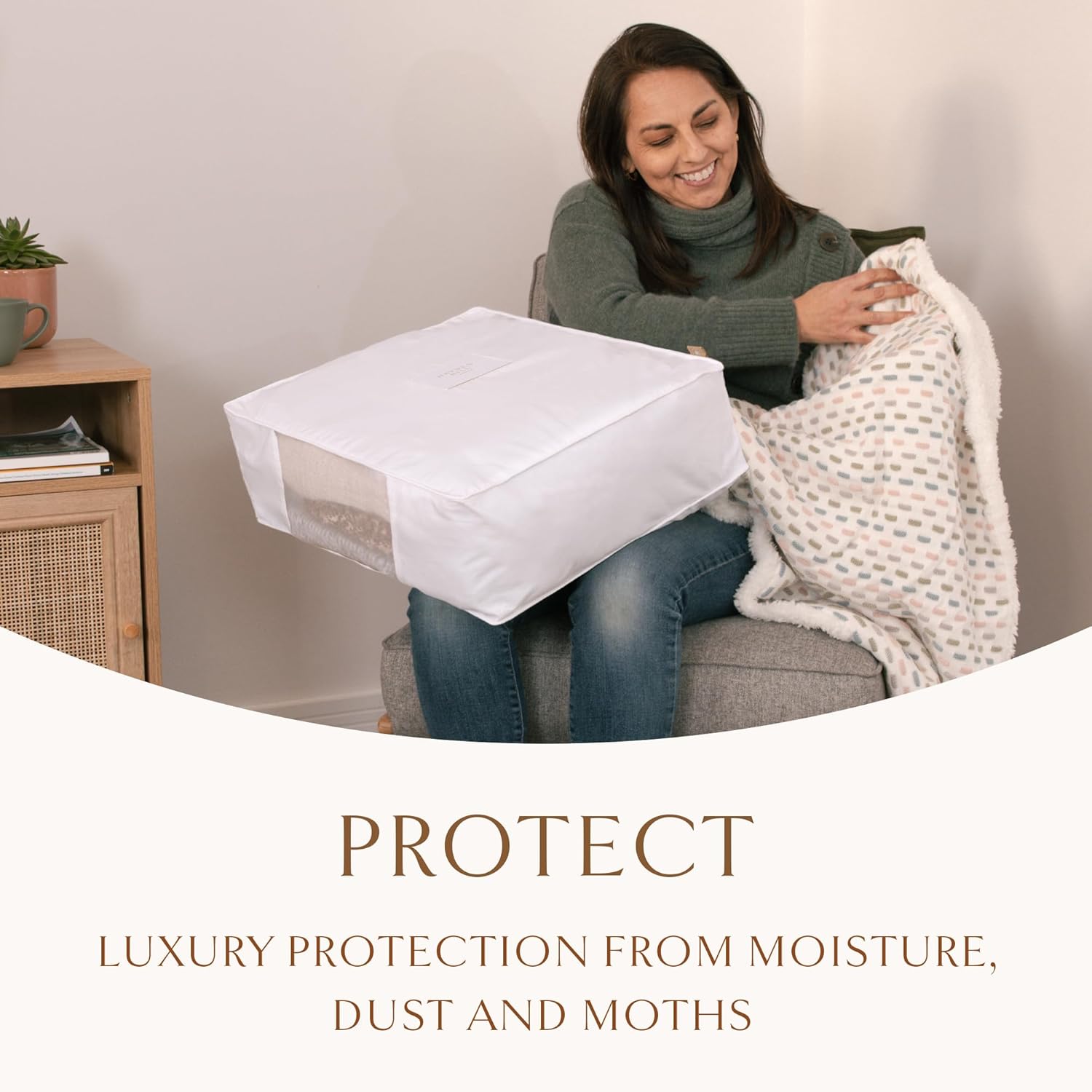 THE FEEL | Made from soft, high-quality Certified Organic Cotton, with a 238 thread count, our blanket storage bags will not only delicately protect your precious quilts, fabrics and cashmere, but also help neatly organize and save space in your closet or wardrobe whilst stored.