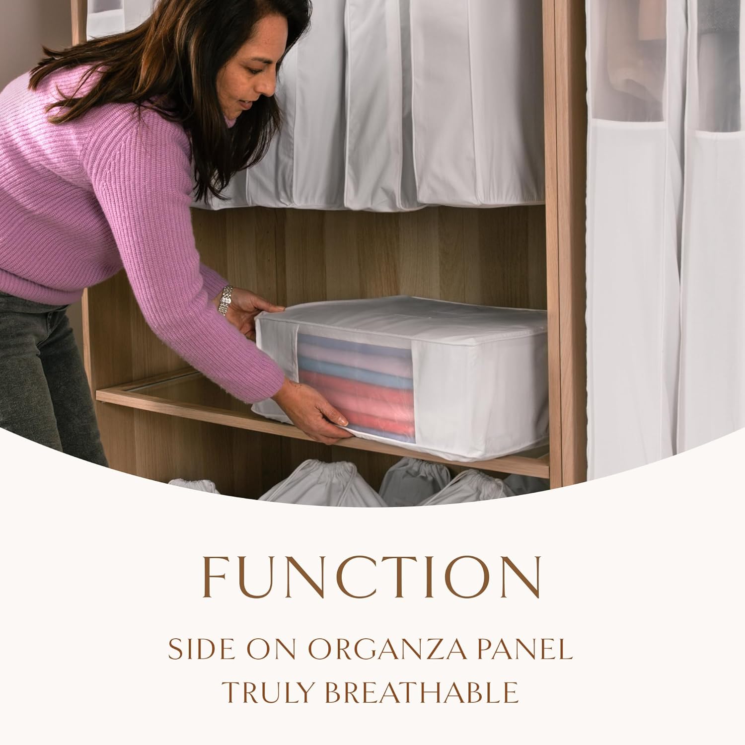 THE FUNCTION | Our see-through Organza panel allows you to easily identify what’s inside. And the detailed piping allows the clothes storage organizer to hold its shape. Designed to protect your clothes and sweaters by keeping moths at bay and moisture from building up.