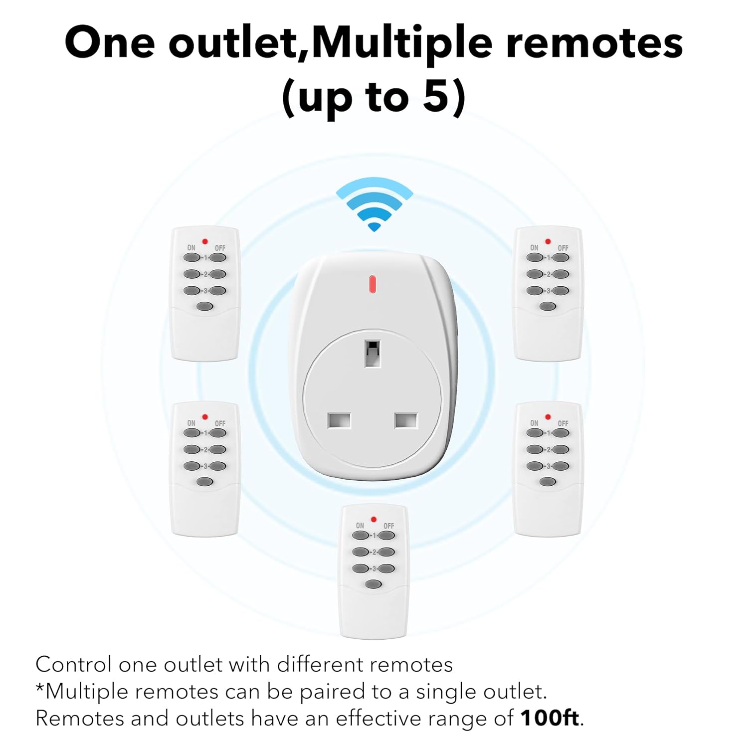 Safe and Reliable: Up to 240V, 50Hz, 13A, 3120W Resistive, our wireless plug socket can be used with most electrical appliances.Outlets will remain off after a power outage to save energy and protect your appliances.