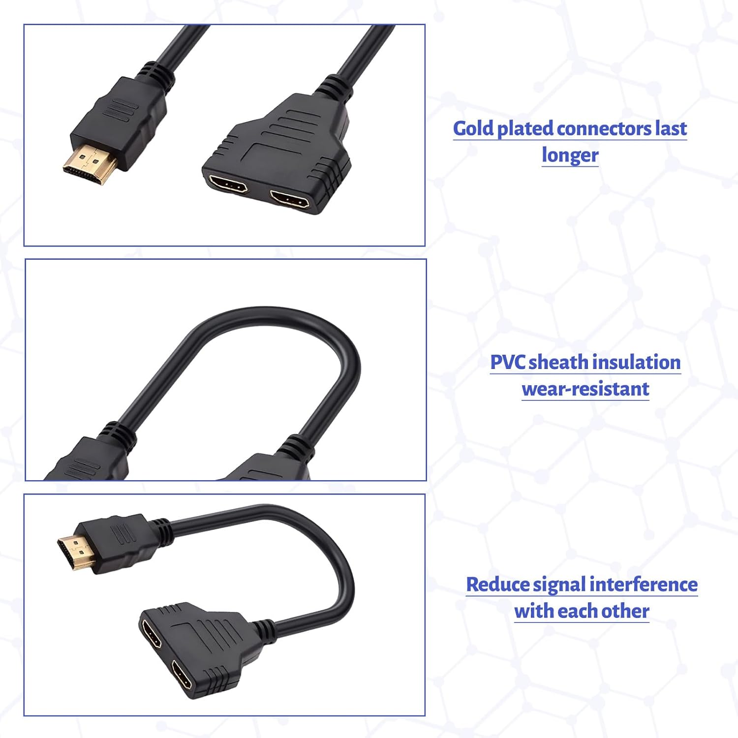 This HDMI splitter 1 in 2 out cable provides clear video transmission, high-resolution images, and supports 480i, 480p, 720p, 1080i, 1080p simultaneously, you can buy with confidence.