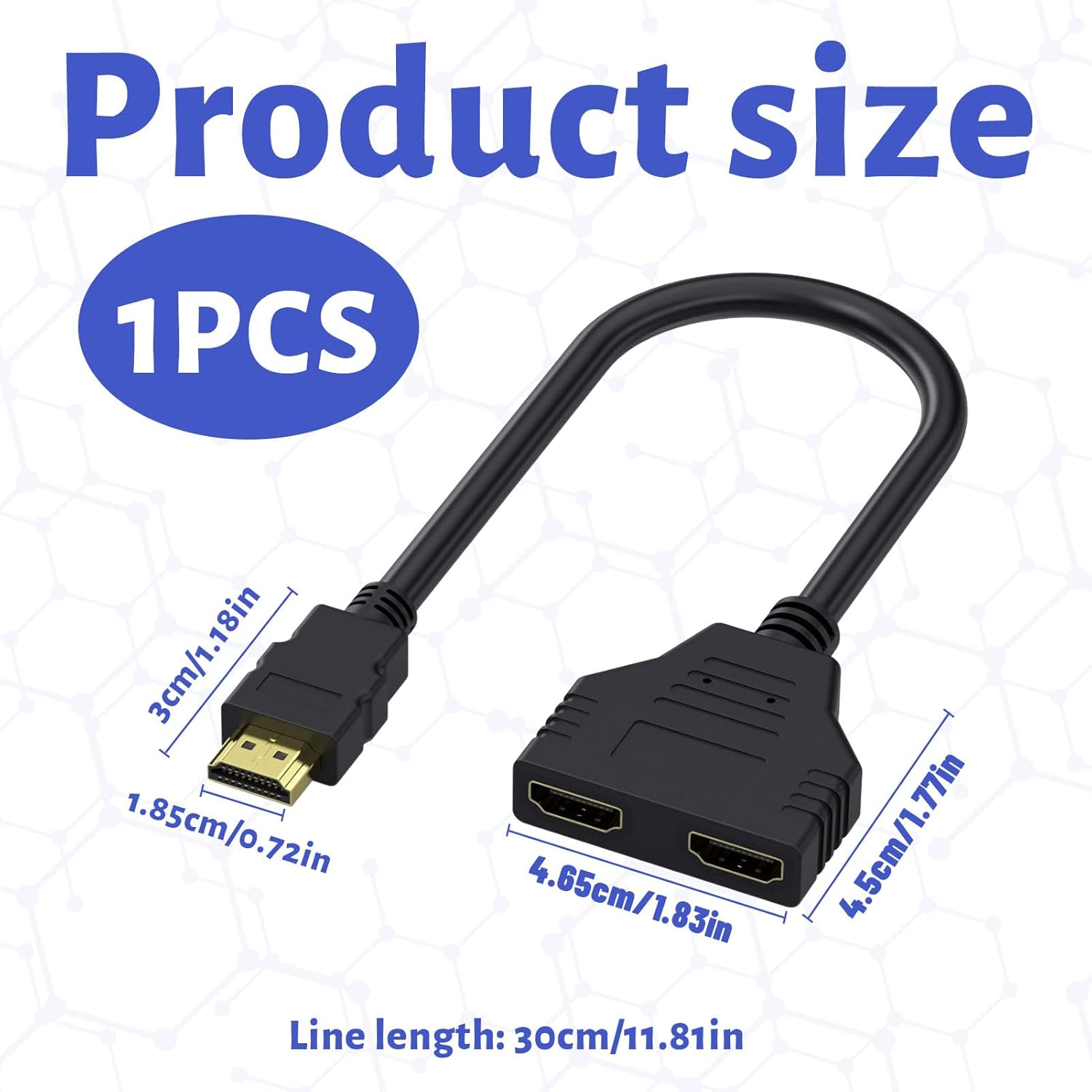 Package Contents: You will get a 1 HDMI male to 2 HDMI female splitter cable, the length of the HDMI splitter is 30cm/11.8 inches, providing you with a solution to connect multiple HDMI devices.