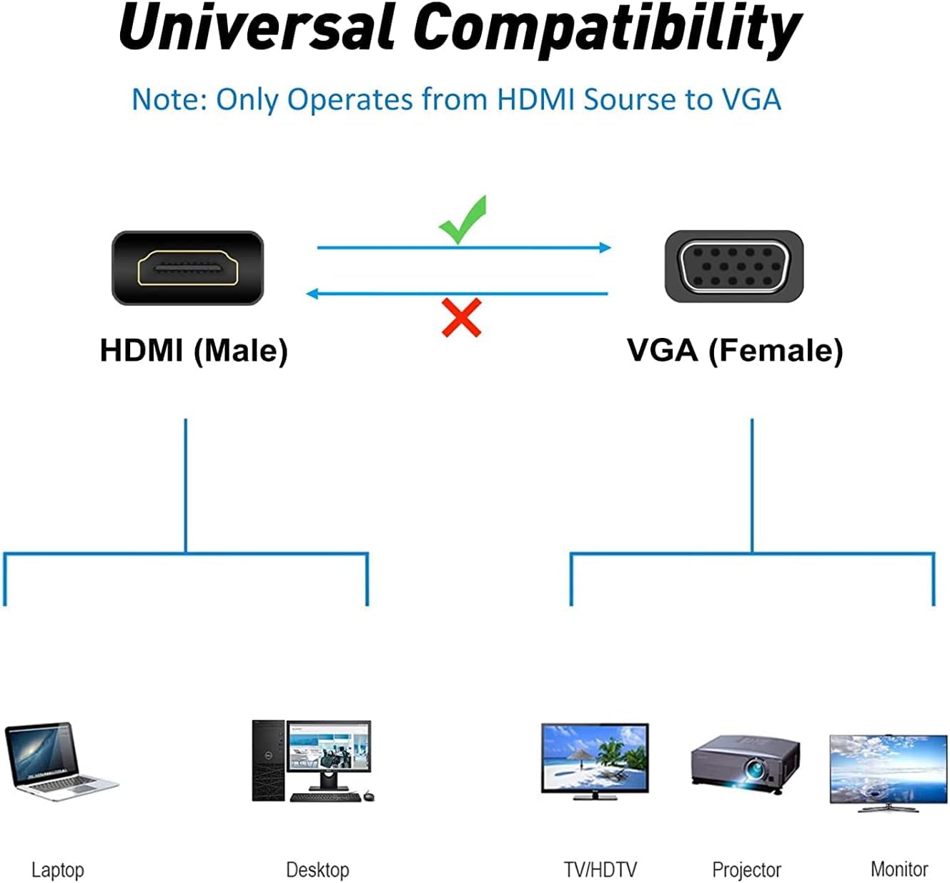【High Resolution】The HDMI to VGA adapter supports video resolutions up to 1920×1080 (1080p Full HD) including 720p and 1600×1200 and 1280×1024 for HD monitors or VGA projectors. ( Note: It is a uni-directional adapter, only converting FROM HDMI source to VGA.)