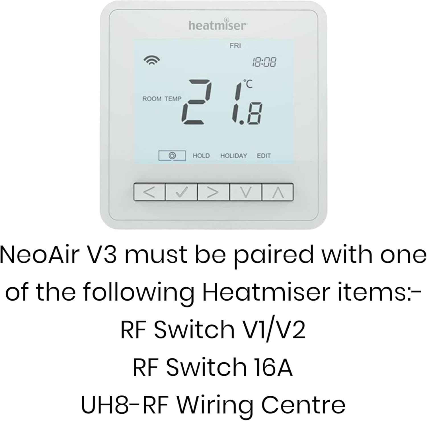 Heatmiser neoAir v3 is a programmable wireless thermostat that is compatible with Heatmiser RF Switch / UH8-RF and neoHub Mini wireless receivers
