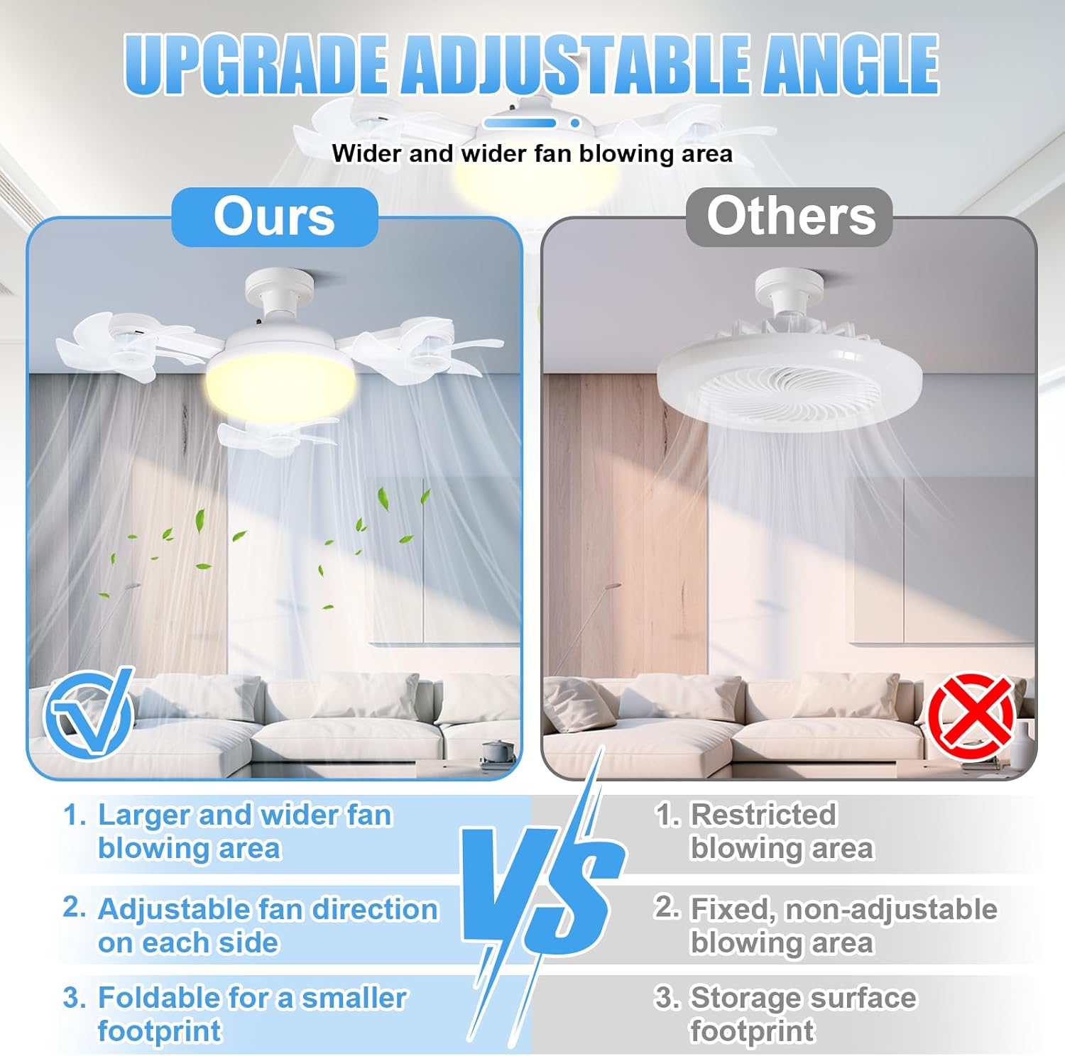【3-Head & Adjustable Angles】Comes with a remote for seamless control of dimming, fan speed, and timing. The 3-head design allows adjustable angles for wider airflow coverage.