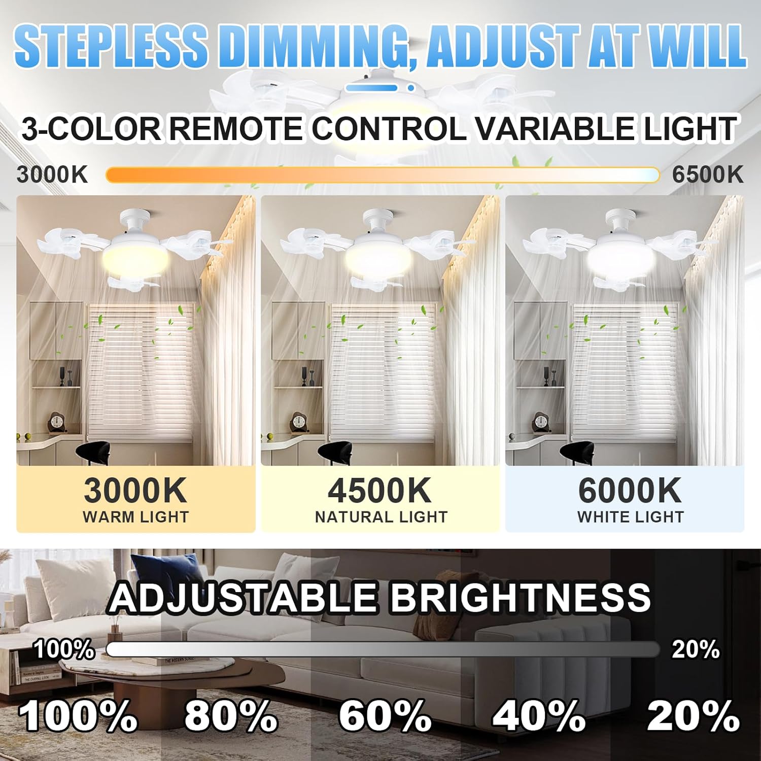 【Adjustable Colour Temperature & Speed】The fan light features a 3000K-6500K colour temperature adjustment, allowing you to switch between warm, natural, and cool light to suit any mood or occasion. Additionally, the fan offers three speed settings (420 rpm, 500 rpm, and 620 rpm) to meet your cooling needs, whether you prefer a gentle breeze or stronger airflow. The 3-head design with adjustable angles ensures wider airflow coverage, enhancing comfort in any space.