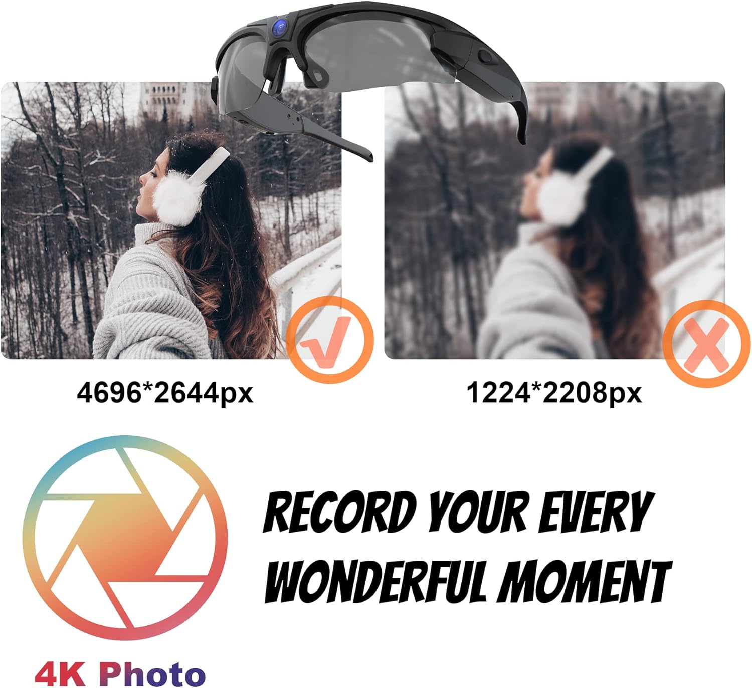 1080P Camera Glasses: The 4K Video Sunglasses records video at 30fps, 1920*1080 pixels resolutions . It gives you a wider field of view and more convenient to record wonderful scenes. The picture format of the photo is JPG, 4696*2644 pixels resolutions. Let you get the High Quality Pictures