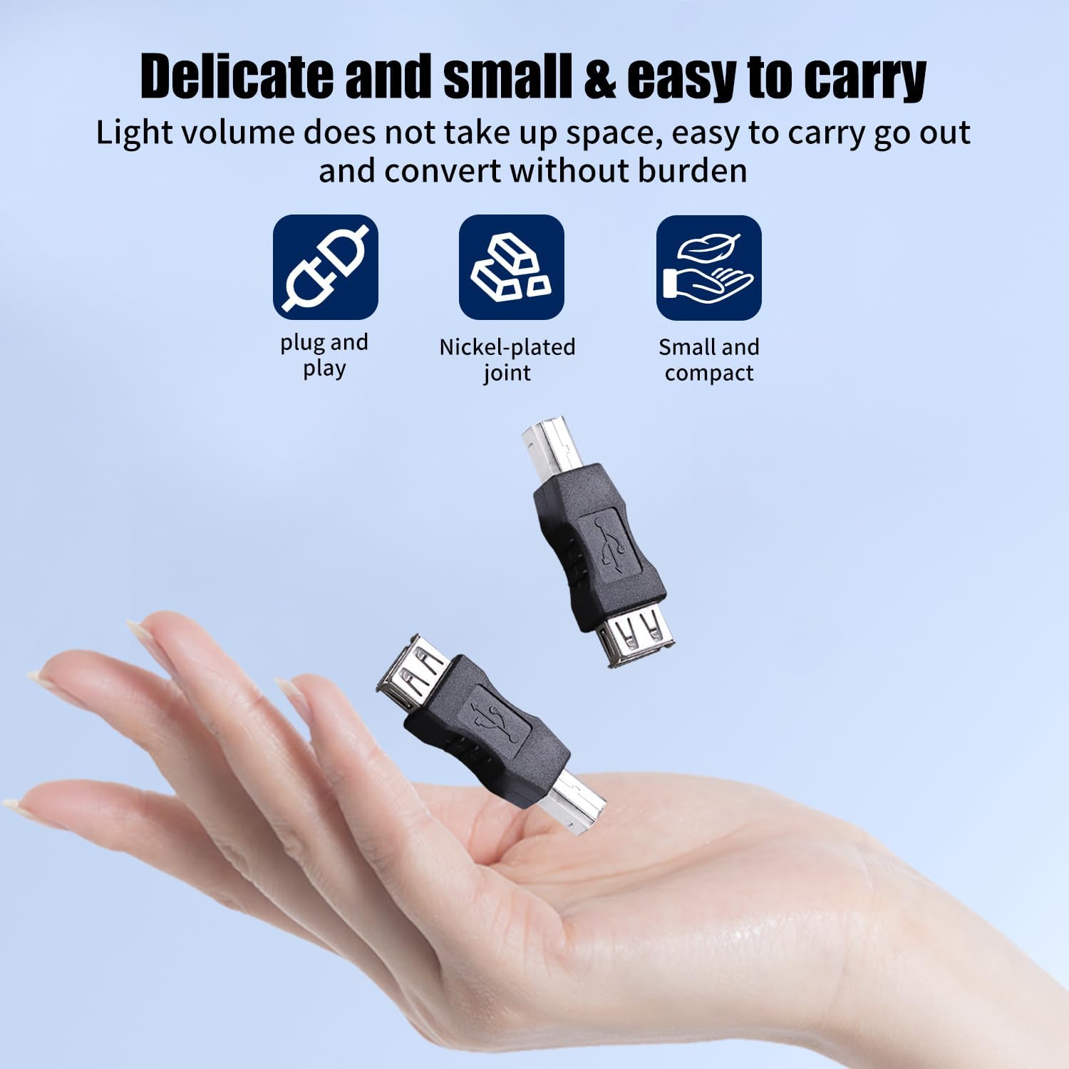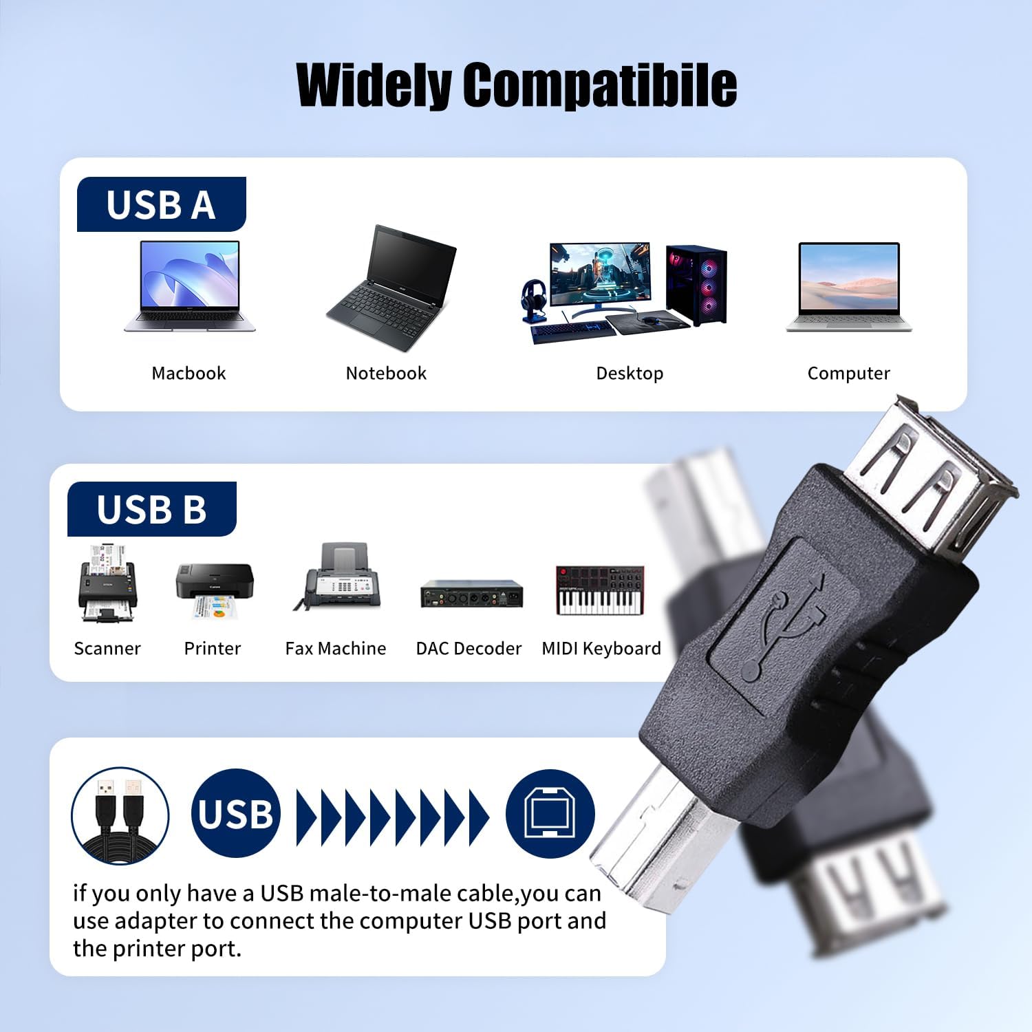 Herfair USB A to B Printer Adapter, USB 2.0 A Female to USB B Printer Male Converter for Printer, Scanner, Fax Machine, More (USB A Female to B Male, 2Pack)